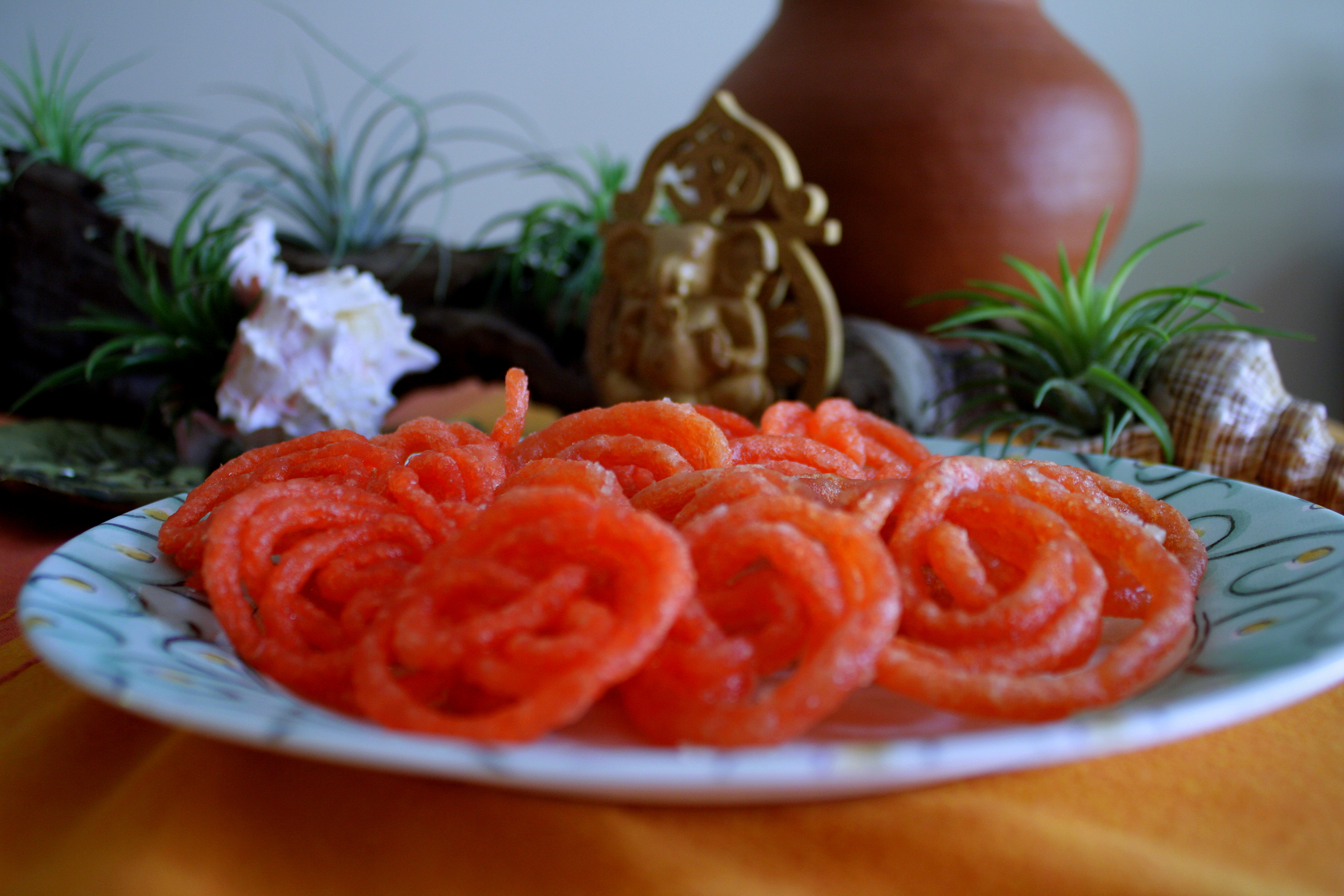 - Applying gentle pressure drop and make circles/ jalebis into the hot oil ( the oil should not be too hot otherwise it will over crisp, jangri color should not change) cook on both sides