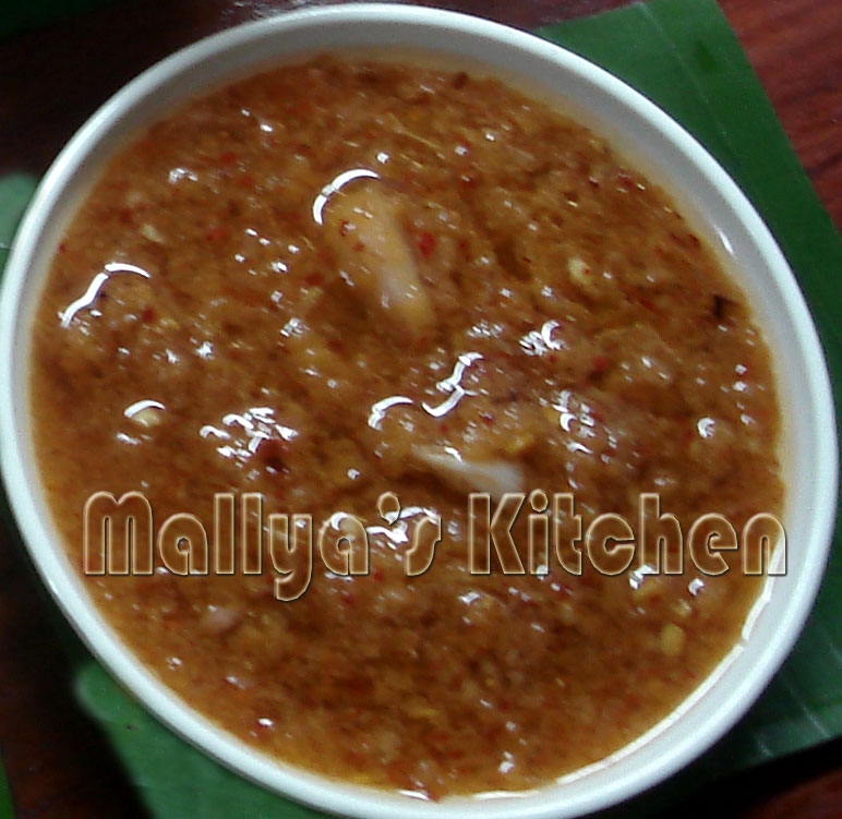 Variation :- Fry half of the onions in oil till golden brown then grind this with roasted/fried red chillies, salt and tamarind to a coarse chutney consistency. Add the rest half raw chopped onions to this and pour coconut oil on top. Mix well and serve.