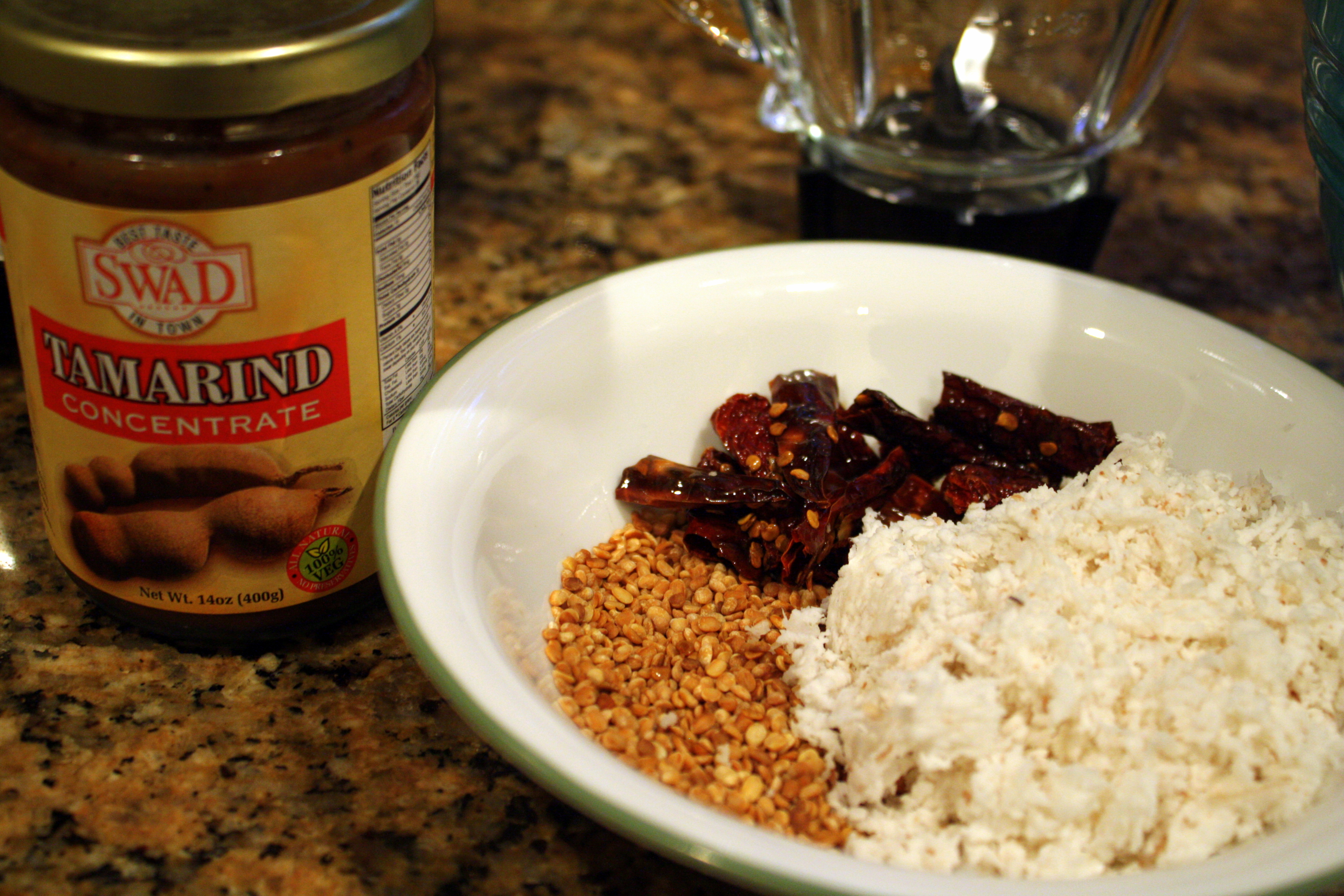 - Grind roasted dal, red chilies, grated coconut and tamarind with a little salt to a coarse paste using as little water as needed. Keep aside.