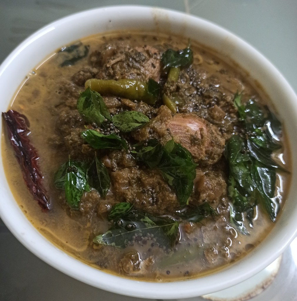 - Grind the grated coconut and fried red chillies into a smooth paste using 1/2 cup of water . If you haven’t used Hog plums earlier then use tamarind while grinding the masala.