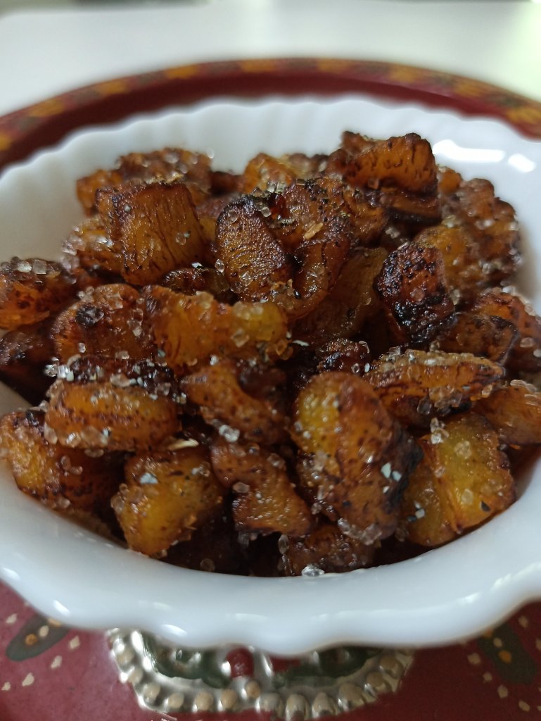 Sweet ripe plantains, fried in ghee is a yummy, quick and filling snack. Make it for the kids as an evening snack to fuel them before they go out and play. For this you need the Nendra variety of banana which are also known as plantains. They work the best for this as they are starchier and retain shape while frying. Kelle tallolo as they call it in Kochi Konkani is usually made during Krishna Janmashtami.