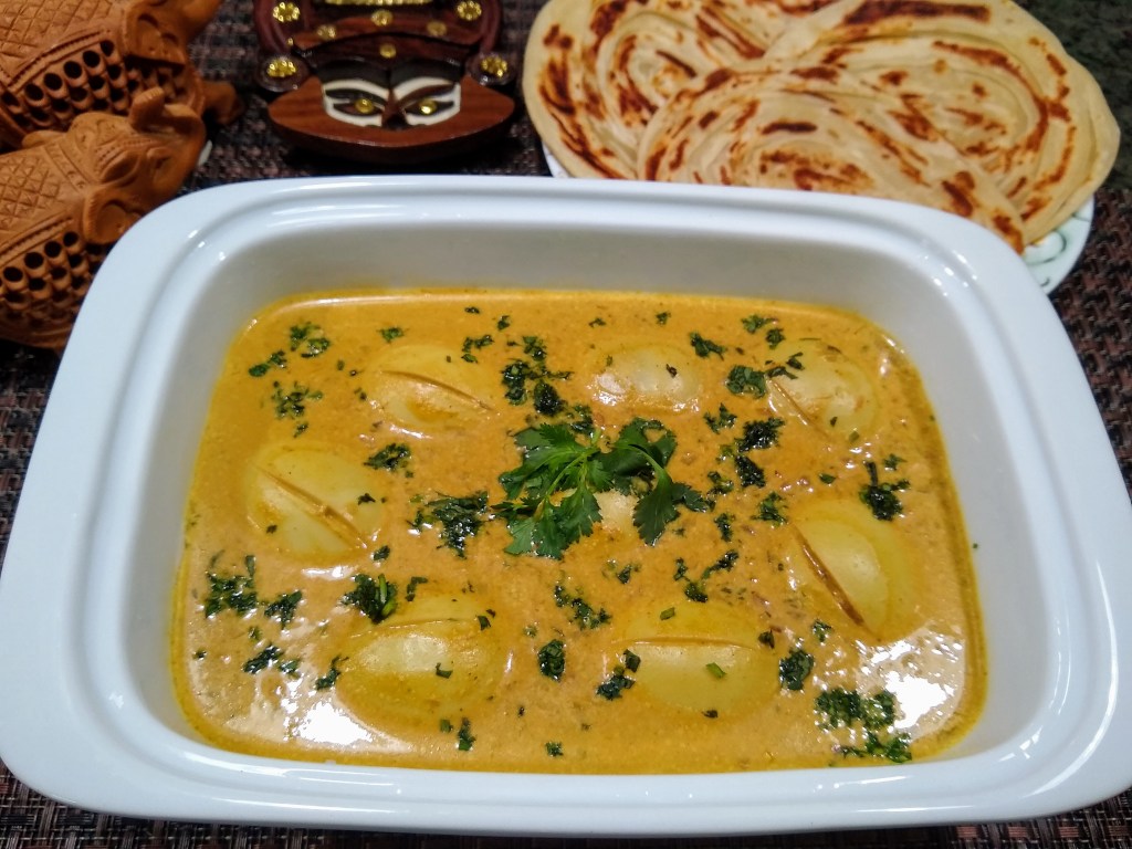 This easy egg curry recipe was first developed when we had just moved to the US in the early 2000s. We were given company accommodation at a hotel which had a small kitchenette consisting of an electric stove, a microwave and a fridge. I didn’t have any extra utensils. Only the few provided at the hotel, a pressure cooker I had brought along with me and no blender. I had to come up with recipes that didn’t need any grinding of masalas. Canned coconut milk was a blessing. I made this curry in a Punjabi bhuna method like I make my rajma masala and then added the canned coconut milk to it, making it a combination of north and south Indian cuisine. The result was so awesome I kept making it the same way for the last 15 years with very little changes.