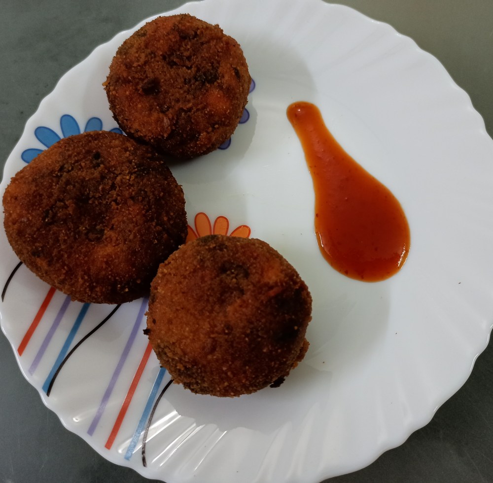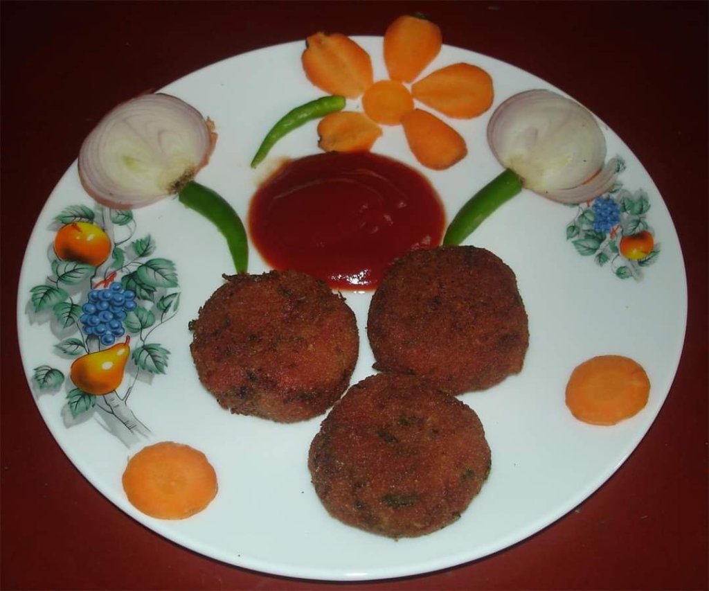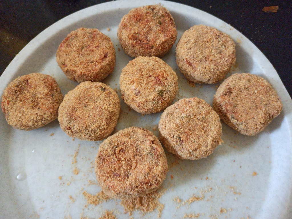 Cutlets made with mashed potatoes and lots of veggies, crisp on the outside, tender and tasty inside go very well with a cup of coffee or tea in the evening . They make a wonderful snack or can even be served as an appetizer. This recipe has been tried and tested by all three of us and has been a hit every-time. The trick to get a perfect cutlet that does not break while deep frying is in making sure that the mixture is as dry as possible and in refrigerating the patties before frying. Refrigeration sets the patties and draws out the last bit of moisture left in the mixture. You can refrigerate or freeze the patties before or after applying the maida-breadcrumbs coating. We have kept these patties in the fridge for up-to a week and they have still tasted great every time. Though we have not tried freezing them, I am sure these patties would freeze well too. Just make sure that they are separated with parchment paper and thaw them well and pat out any excess moisture with a paper towel before frying, otherwise they may still be cold inside and could break. If refrigerated /frozen after applying the maida-breadcrumb coating and it still feels wet after thawing you can reapply the bread crumbs mixed with a little bit of dry maida before frying.