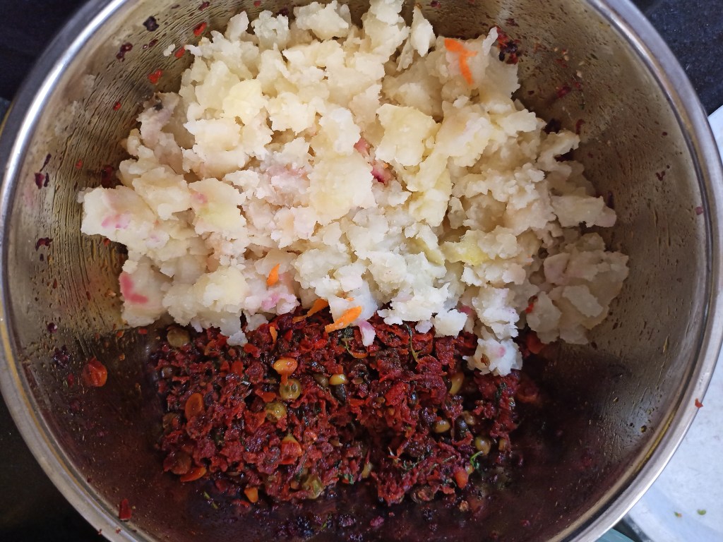 - Roughly mash the boiled potatoes and add to the cooked, cooled mixture. Mix well. The mix shouldn’t be soggy. Make sure that both the vegetables and potatoes have cooled well before mixing, otherwise the mixture turns soggy.