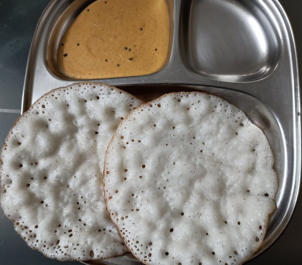 6. Place a ladle full of the batter on medium hot griddle and spread it lightly with the back of the ladle in circular motion . Remember this dosa is spongy hence don’t spread too much .