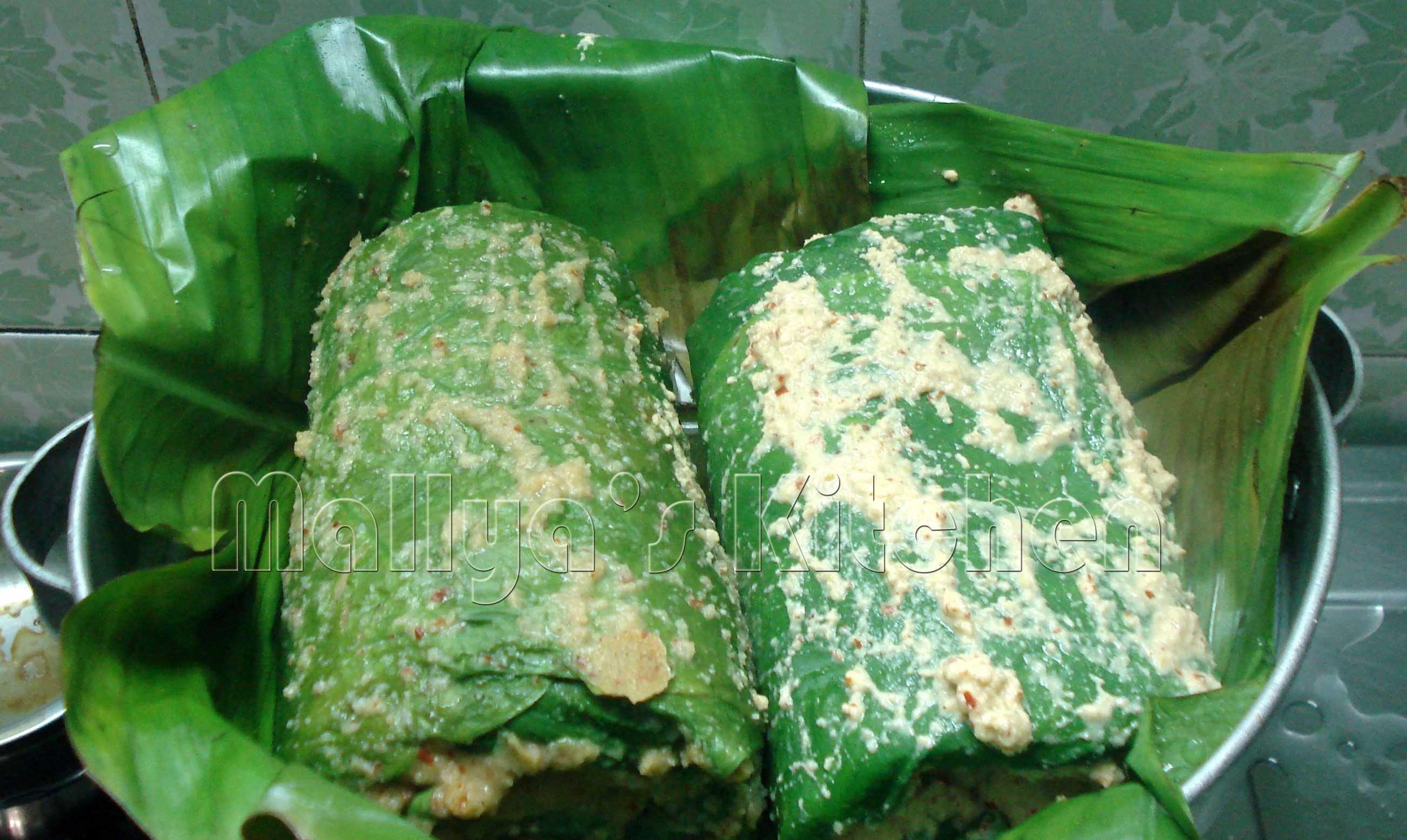 - Place a big size leaf on your work place,smear the masala paste, repeat with another leaf .