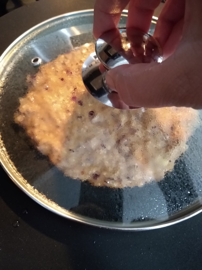 - Cook closed under a lid until the top looks done.