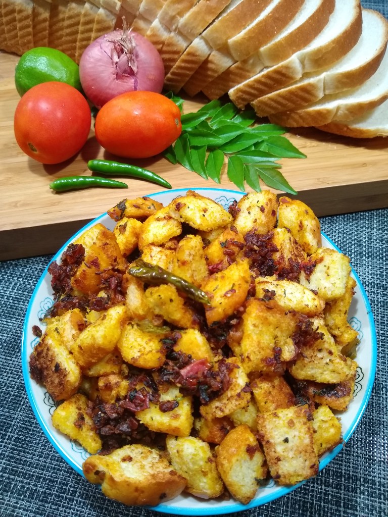 Stale leftover bread? Make bread masala upma or as we Konkanis call it, bread-a usli. Tangy, sweet and spicy it makes a great breakfast or snack. We usually use old stale bread that is not soft anymore, but here in the USA the regular white bread has a long shelf life and doesn’t harden up as much, so I usually toast it a bit before making this recipe. Soft bread ends up becoming too mushy in this recipe. You need bread that would still hold up shape while cooking.