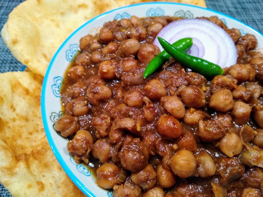 Choley is a Punjabi dish that is famously made in North India and in Pakistan. Choley batture is a staple in the streets of Delhi. One can have this anytime of the day, eat it as a heavy breakfast, lunch or dinner. There are many variations of this dish but choley basically means Kabuli chana (white chickpeas) so that remains the same. It is never made with kala chana. Then how is it dark in color, you ask? Two words – Tea leaves. The chana is soaked overnight with a tea bag and also cooked along with it. Here I have not soaked it with a tea bag but have pressure cooked it with one of my favorite brand of masala tea bag. If you dont have a masala tea bag, you can also use a regular tea bag. This recipe is not very authentic and is made by me being inspired by many variations of this particular dish. Variations like Amritsari choley, Pindi choley, Khattey choley so on and so forth. So this recipe is a mish mash of these variations, made to my taste. Even though one can have choley with batture, naan, kulcha, poori or even white rice, I find my all time favorite pairing is with batture. Served with a few slices of raw onions marinated in lime juice and maybe a green chilli to bite into.