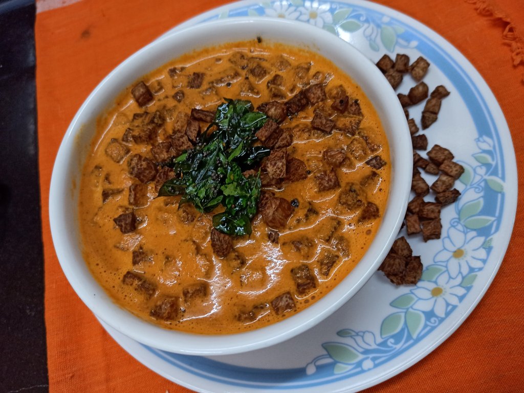 In traditional ,G S B style cooking , there are different types of side dishes . Sukke , Song , Ghasi , koddle etc are dishes which are made with cooked masalas . There are few dishes like koota ,Gojjus , Bajji , Bharata etc which does not use cooked masala . The shelf life of these dishes are say one day to the most . Basically these are ready – to – eat . In koota we can used vegetable like yam , Chinese potato , phagil ( Spiny gourd ) . The vegetable is crispy fried and add to ready masala and served immediately . The idea is to keep the crunchiness intact while eating . Only then we can enjoy the koota authentically . Here I have used the most popular vegetable for koota , yam .