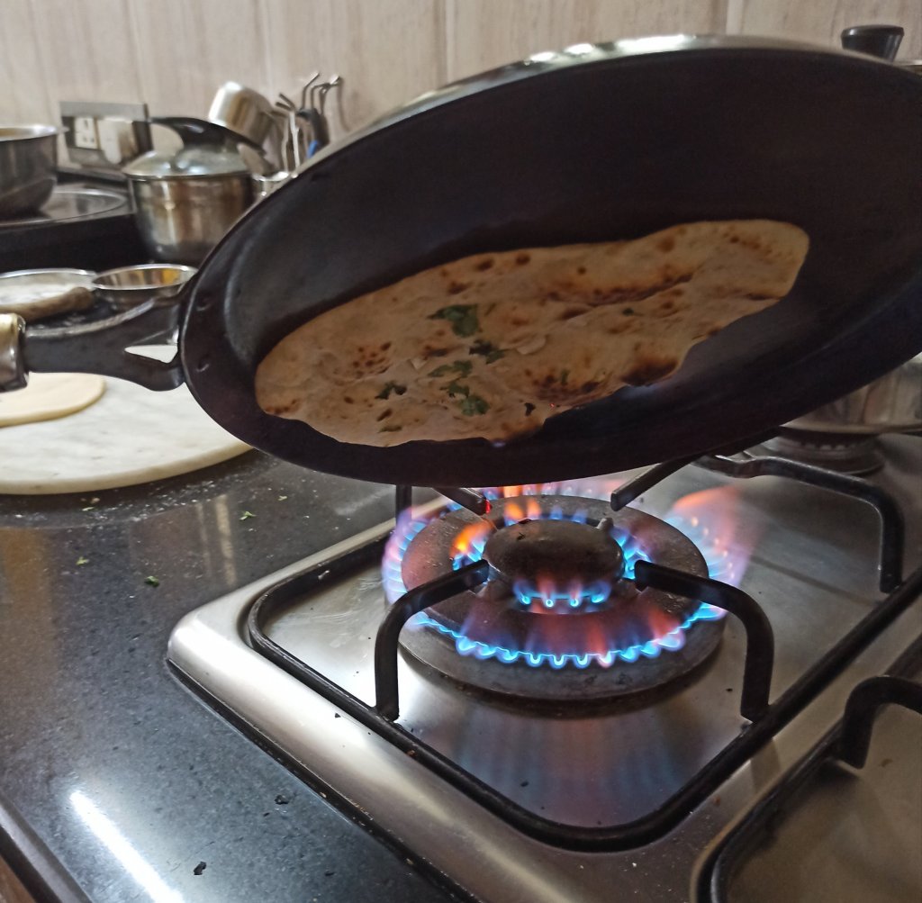 12 . Soon you will see bubbles on the naan , Immediately turn the tawa on direct gas flame .