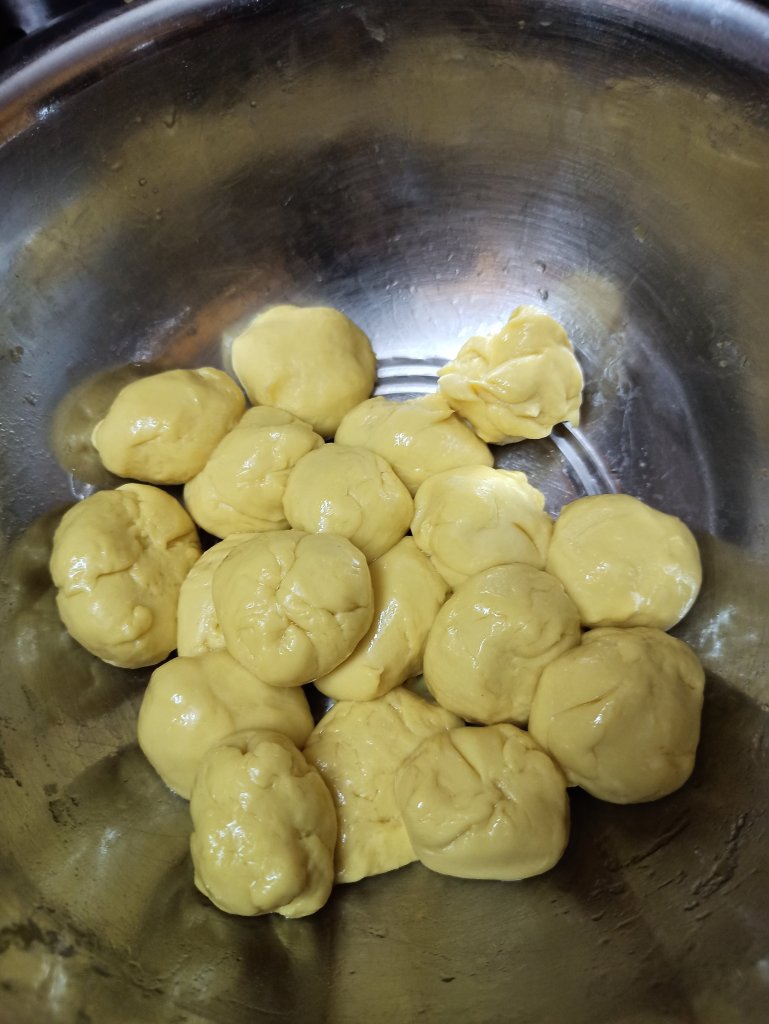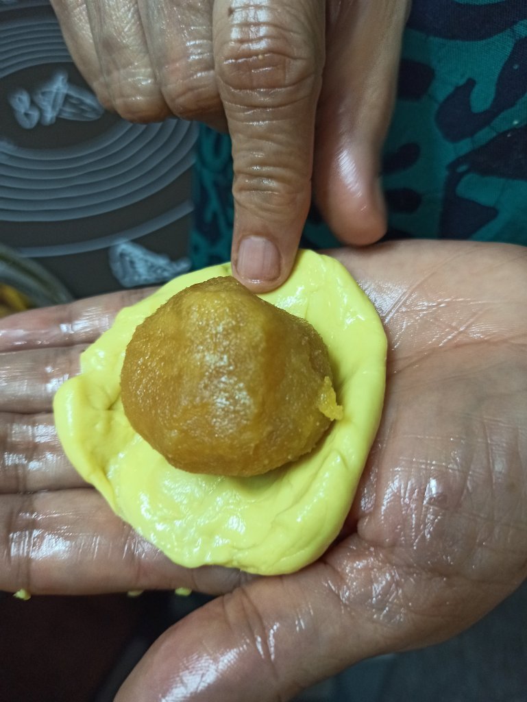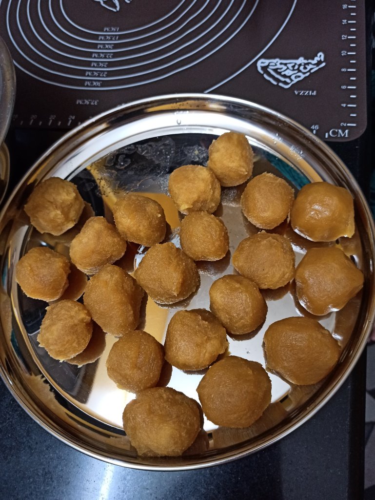 10. Prepare equal sized balls from stuffing also, when it is still warm. These balls are slighter bigger than outer cover balls, cover it with lid.