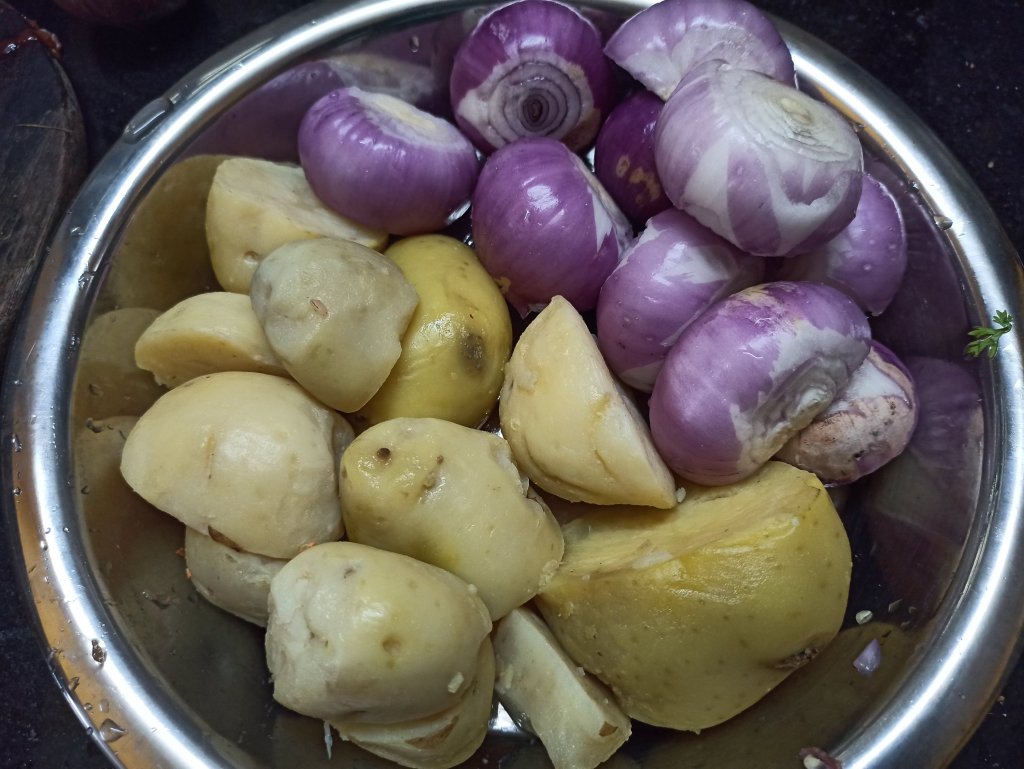2. Pressure cook potatoes with enough water for 2 – 3 whistles .