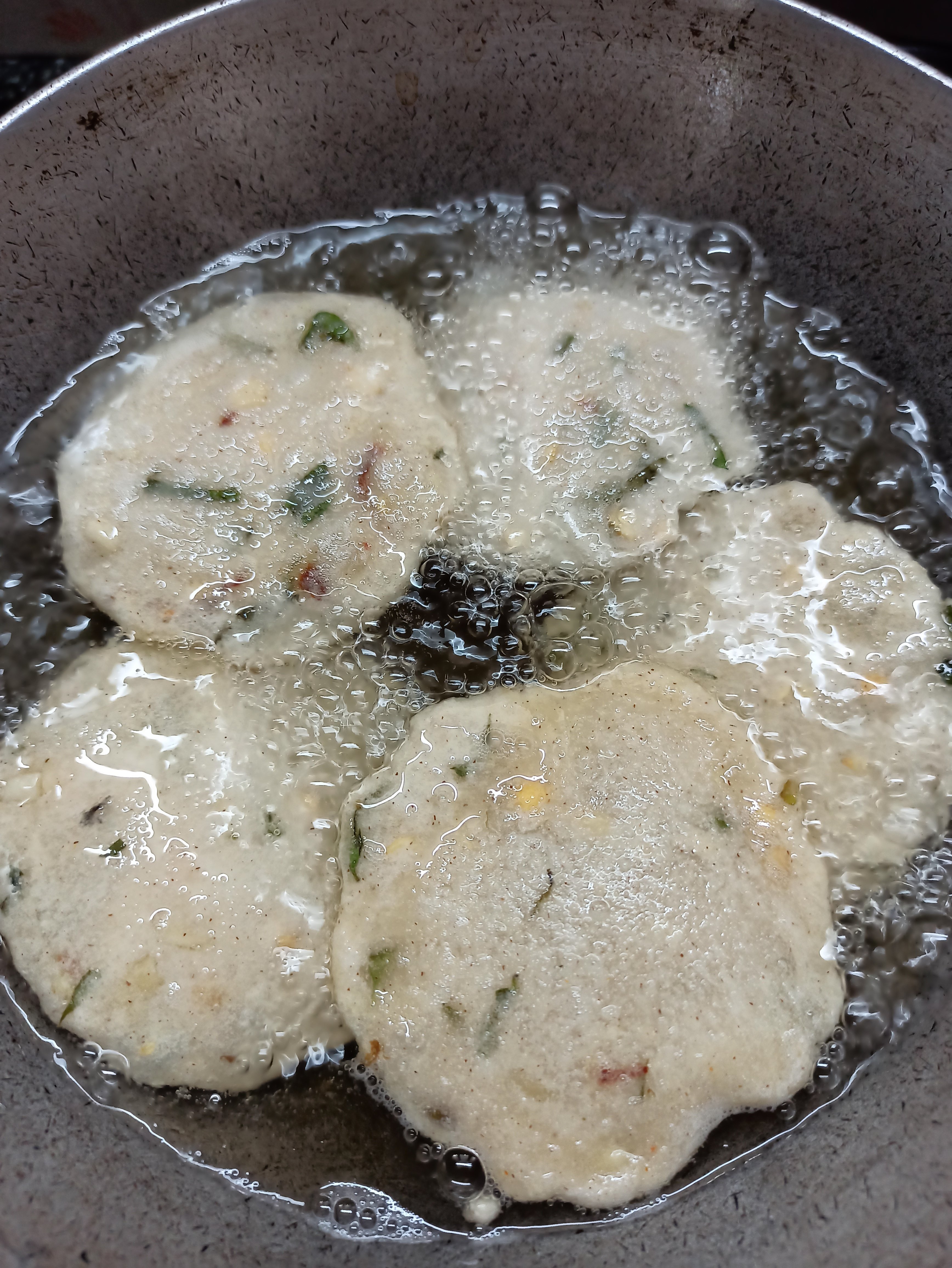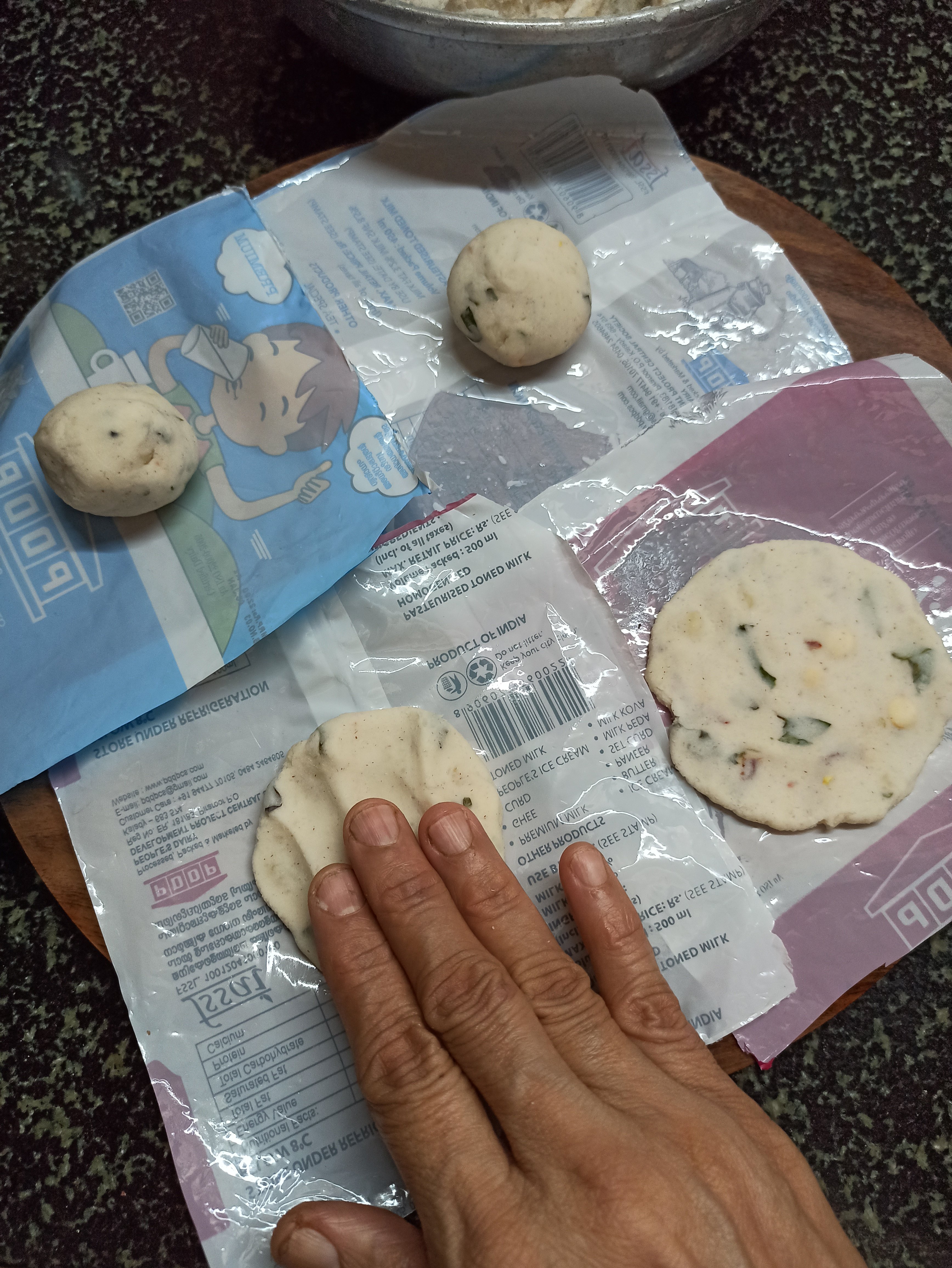 13 . Pat on top of greased polythene sheet to form thick flat circle ( like Puri ) .