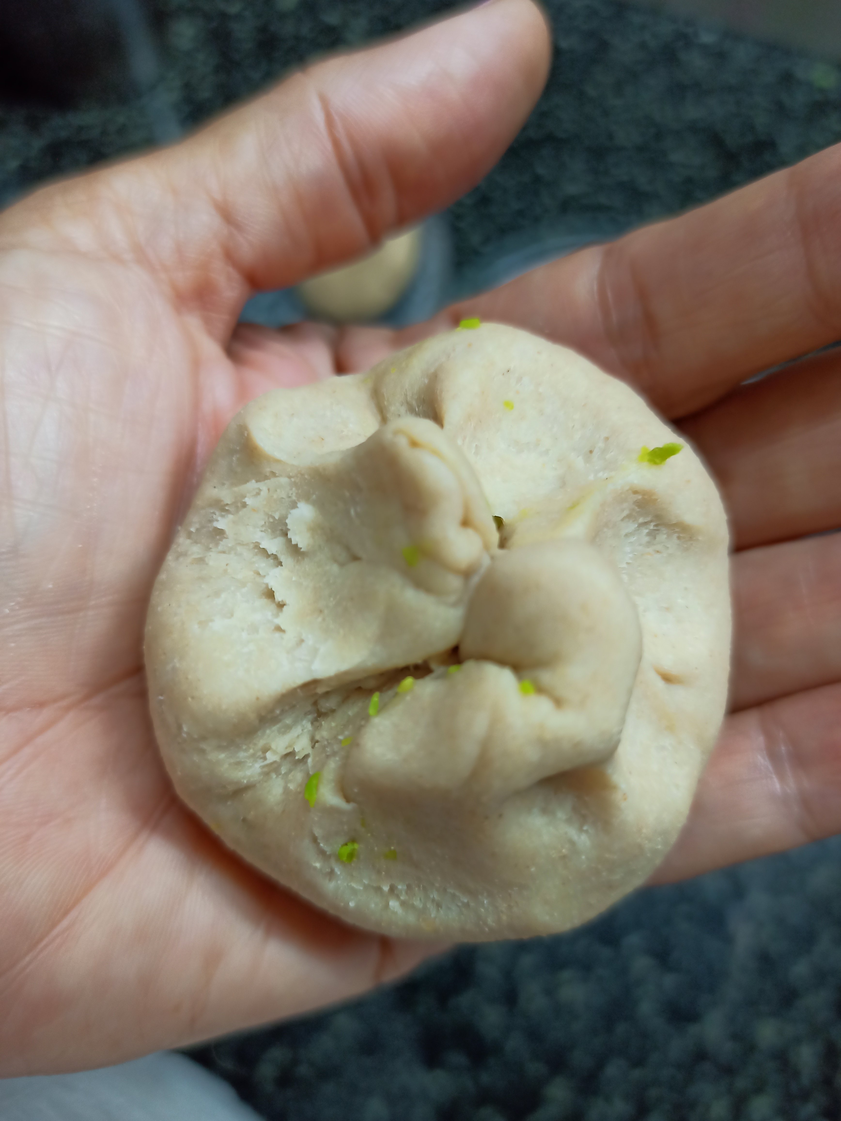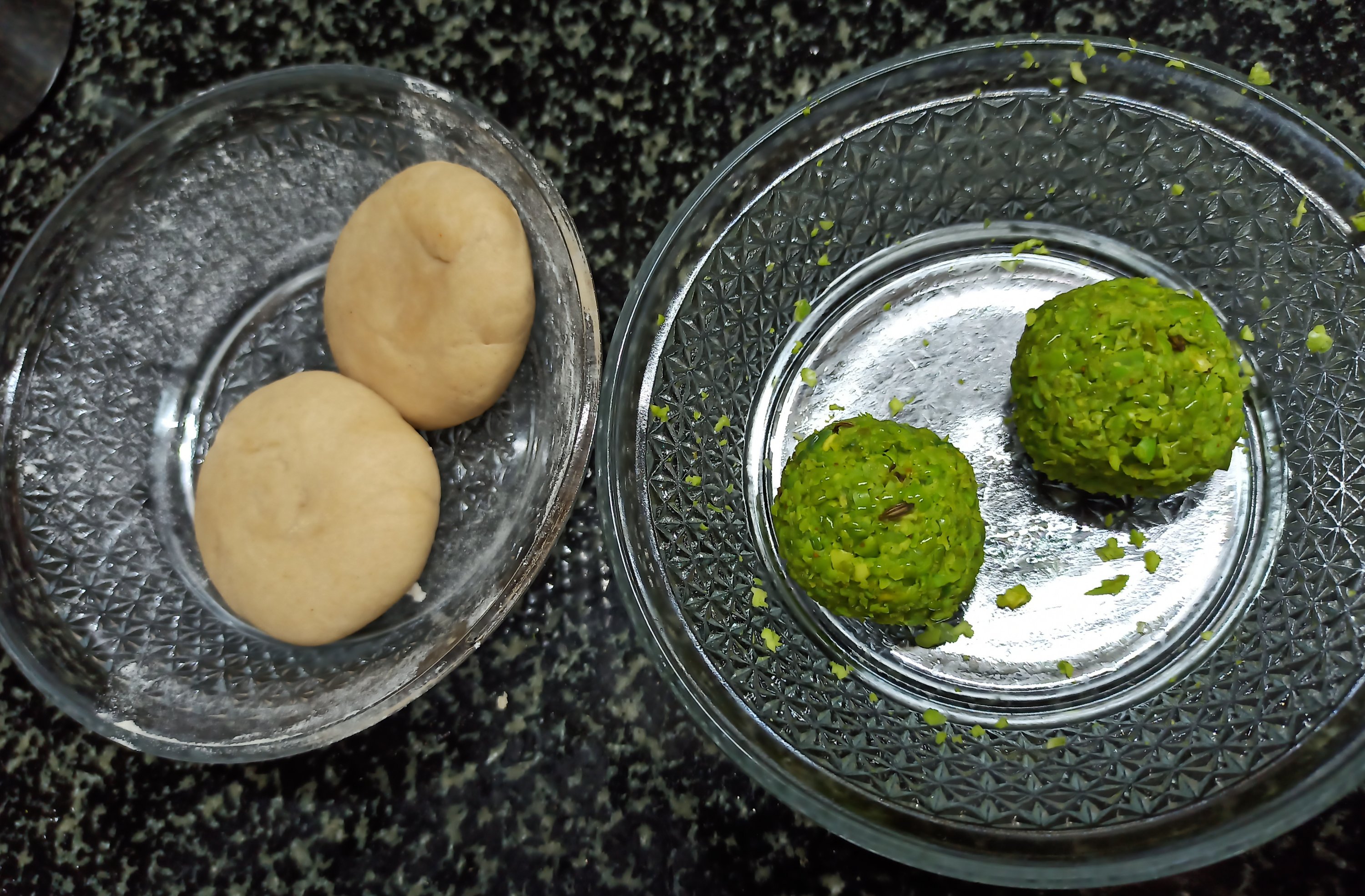 1 . Make equal size balls from outer dough ( slightly bigger than inner mixture ) .