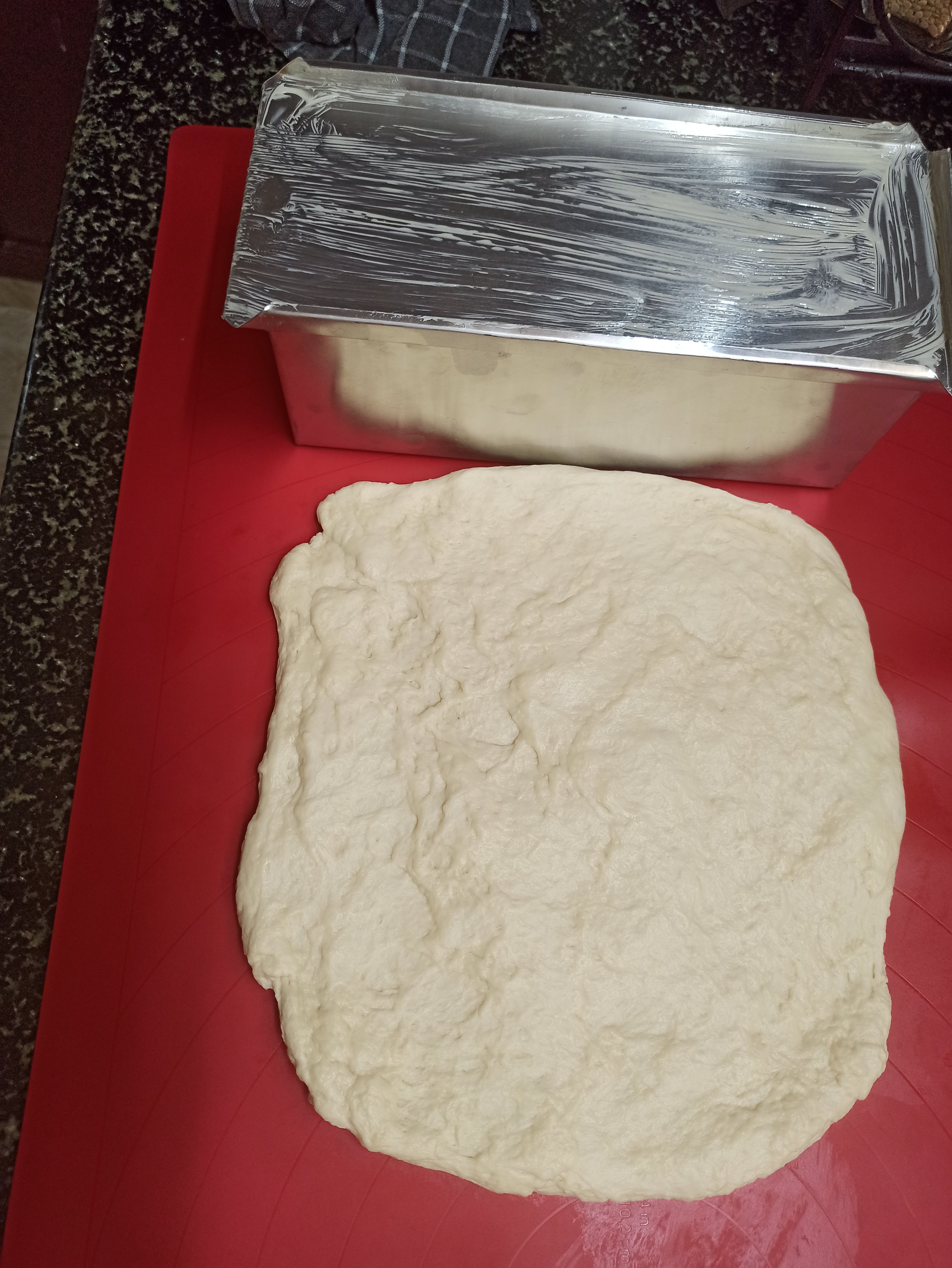 13 . Cover the loaf tin with damp cloth . Keep it in a warm place for rise atleast 45 minutes .