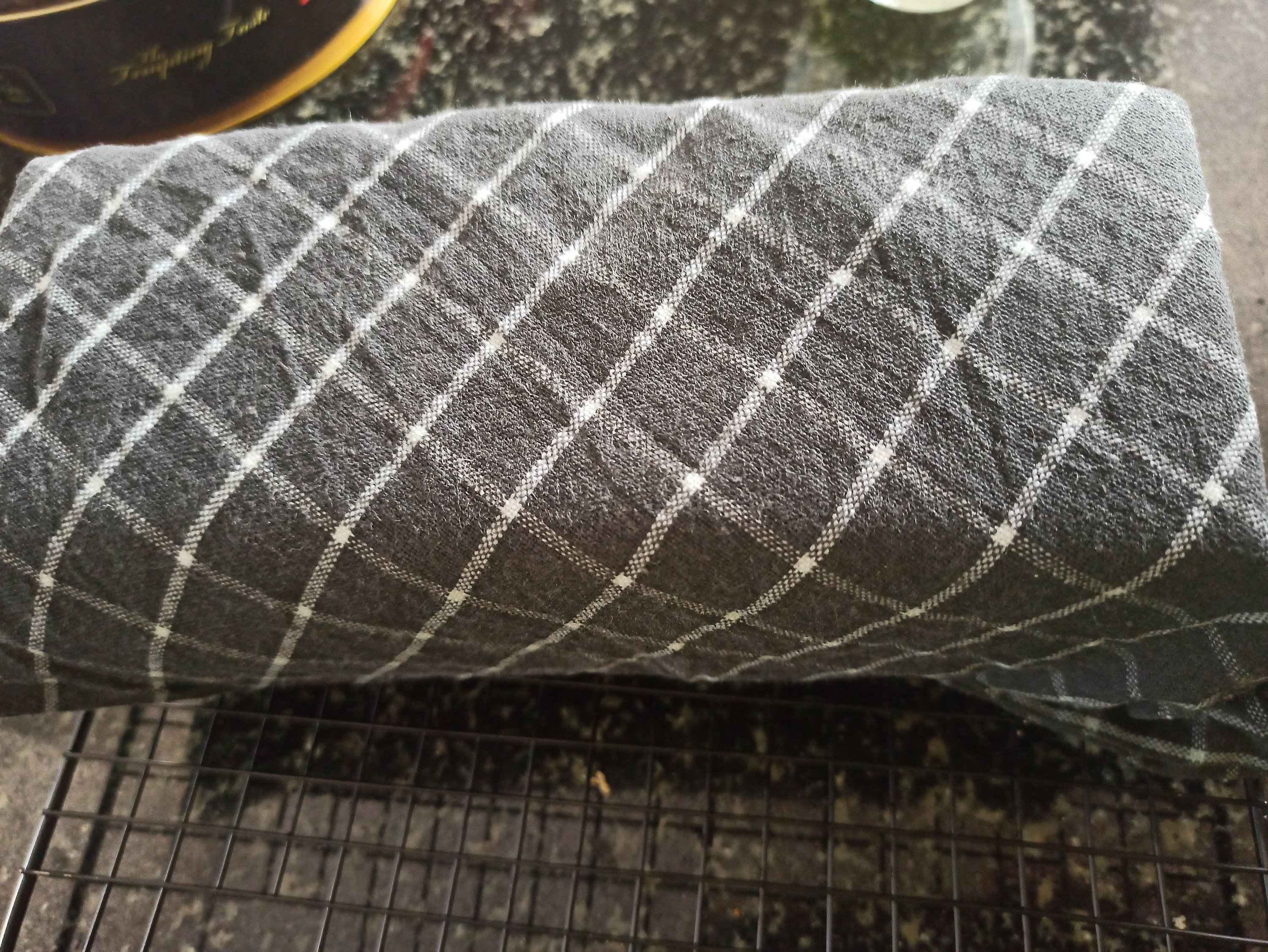 19 . Keep the bread on wired rack , covered with kitchen towel to cool .