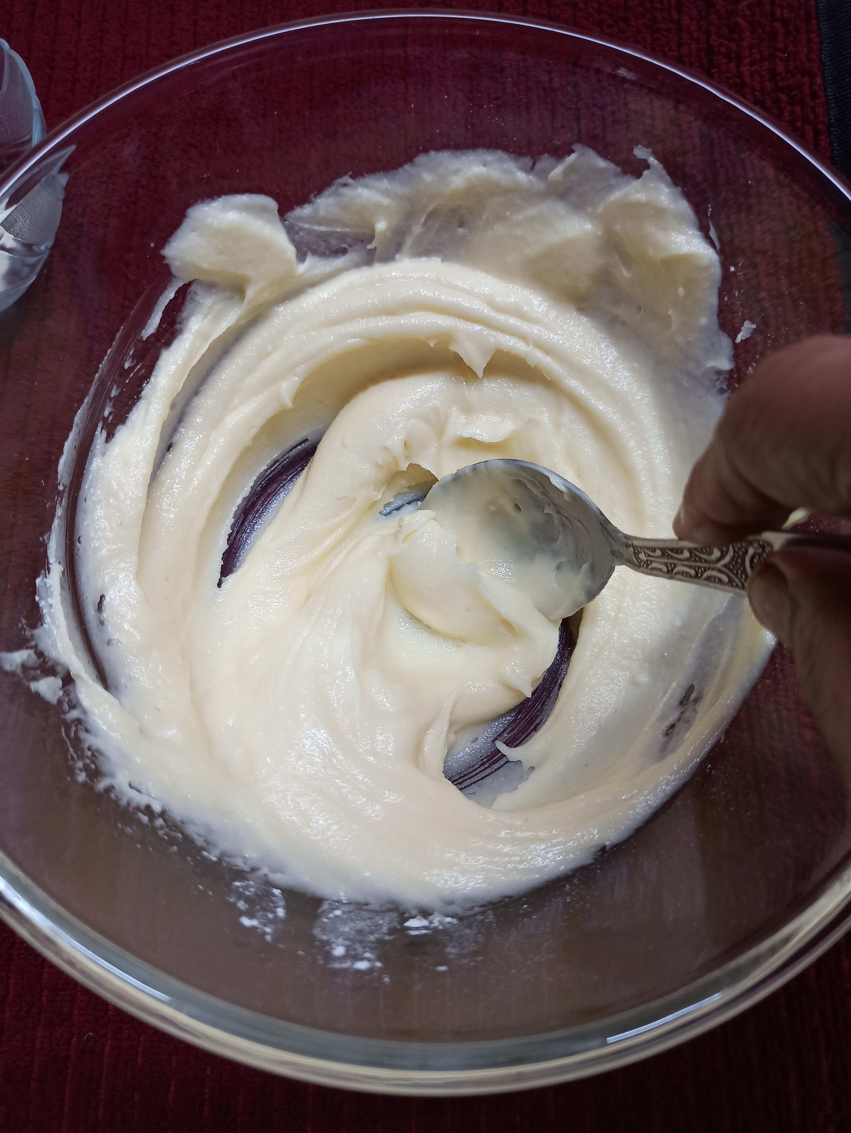 4 . In big mixing bowl cream the butter and sugar powder with spatula or whisk up to light and cream .