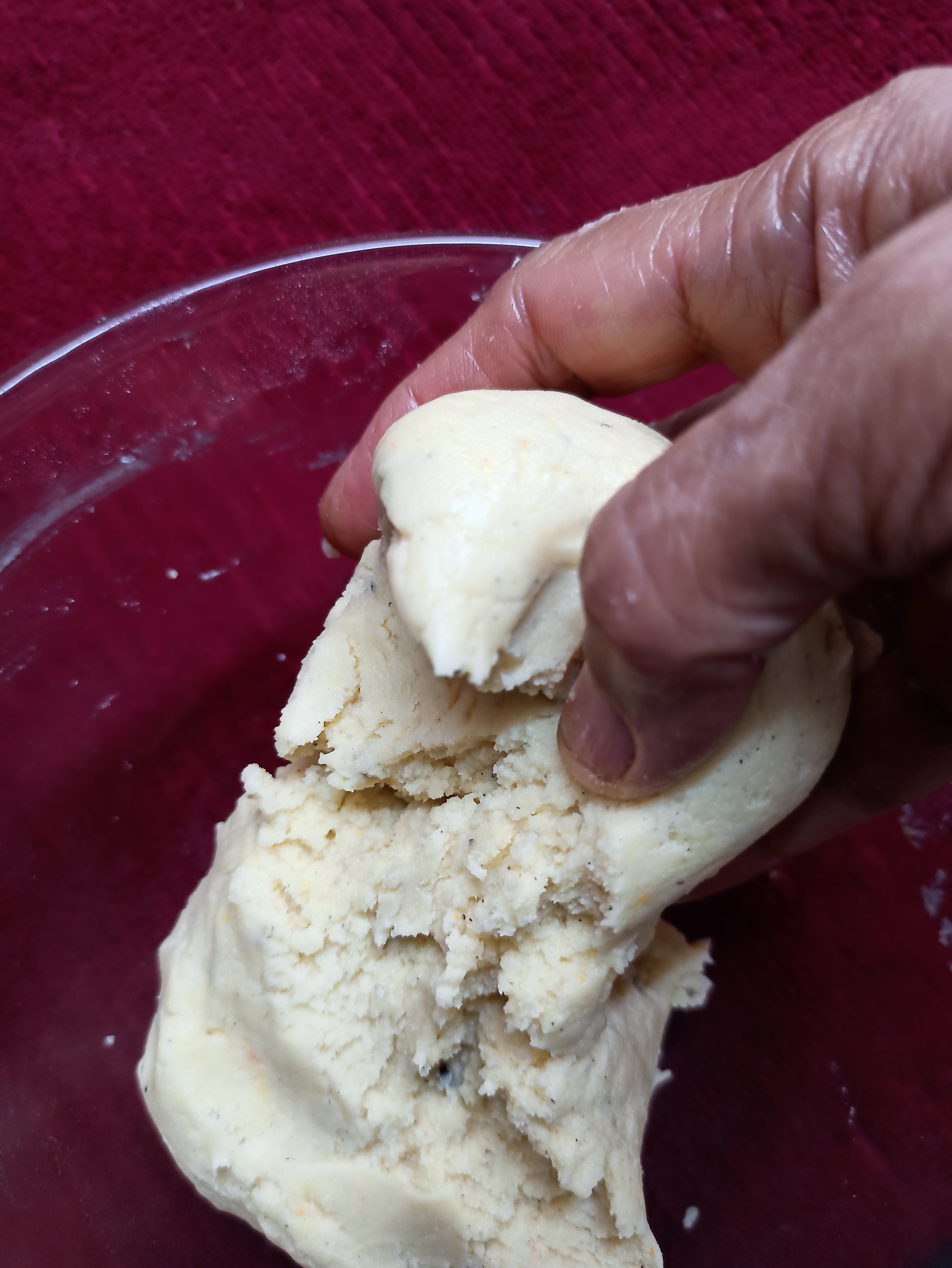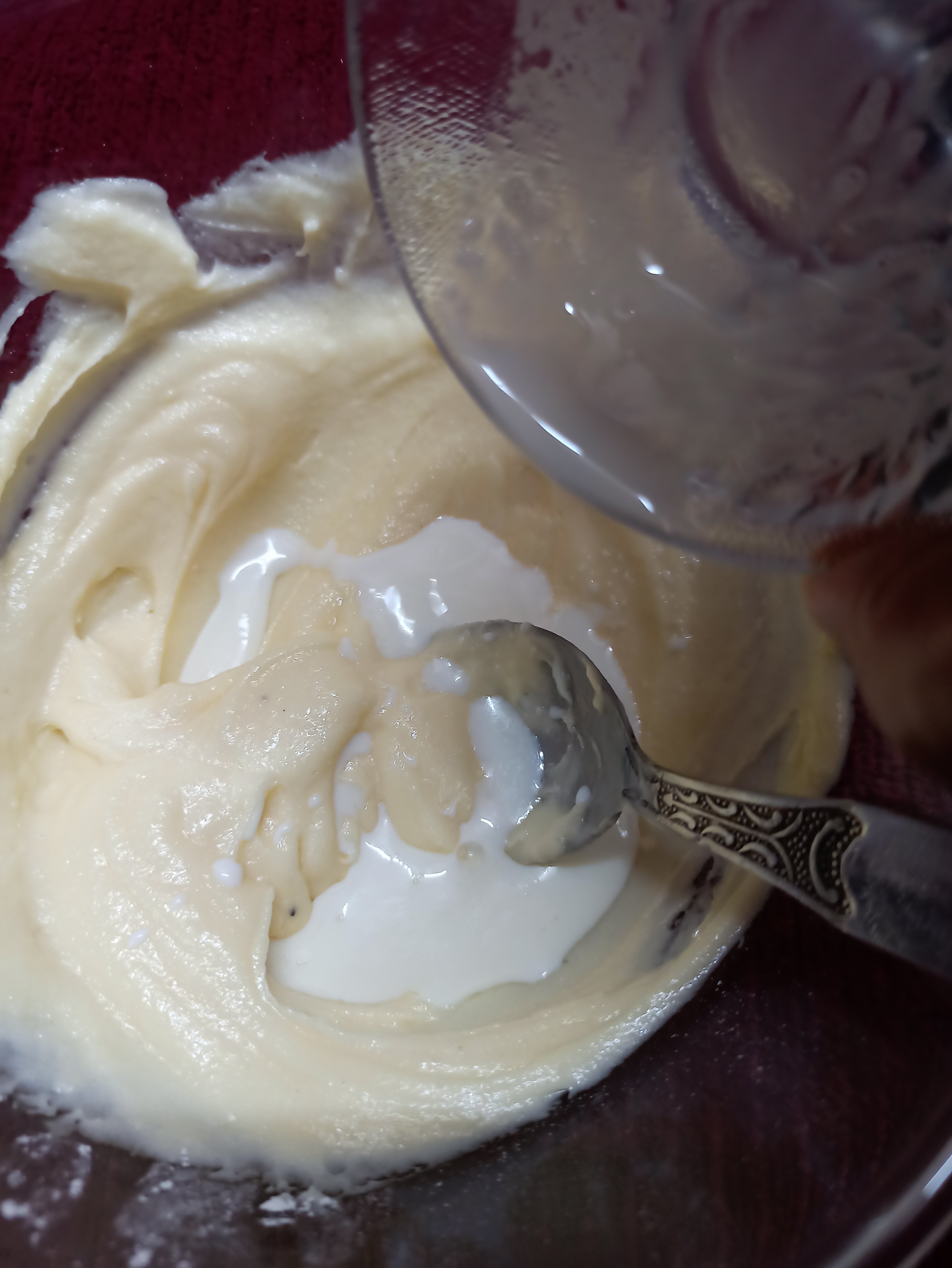 6 . Add maida mixture little at a time to the creamed butter and mix well . Add cardamom powder and mix well . Use spatula for this .