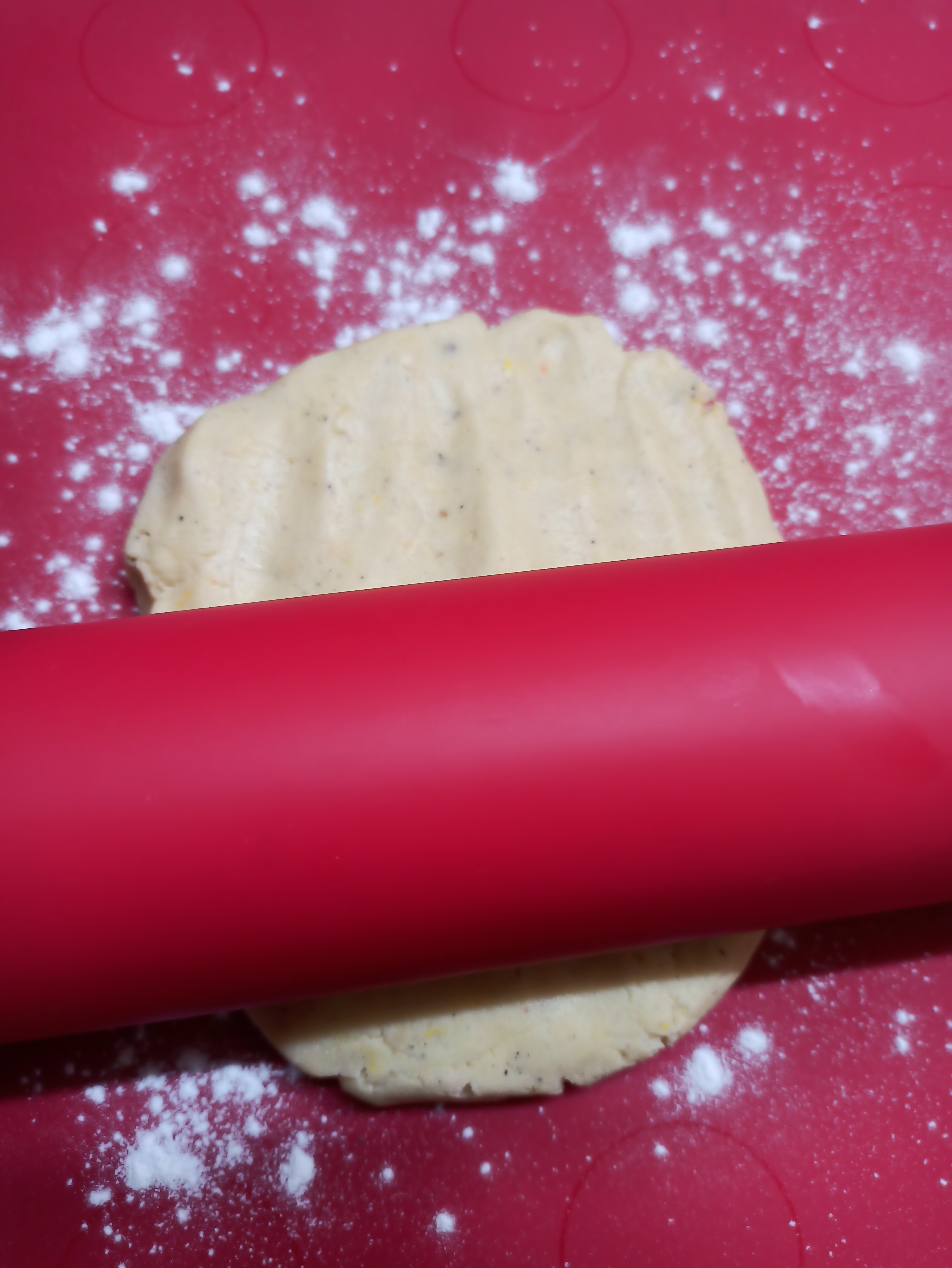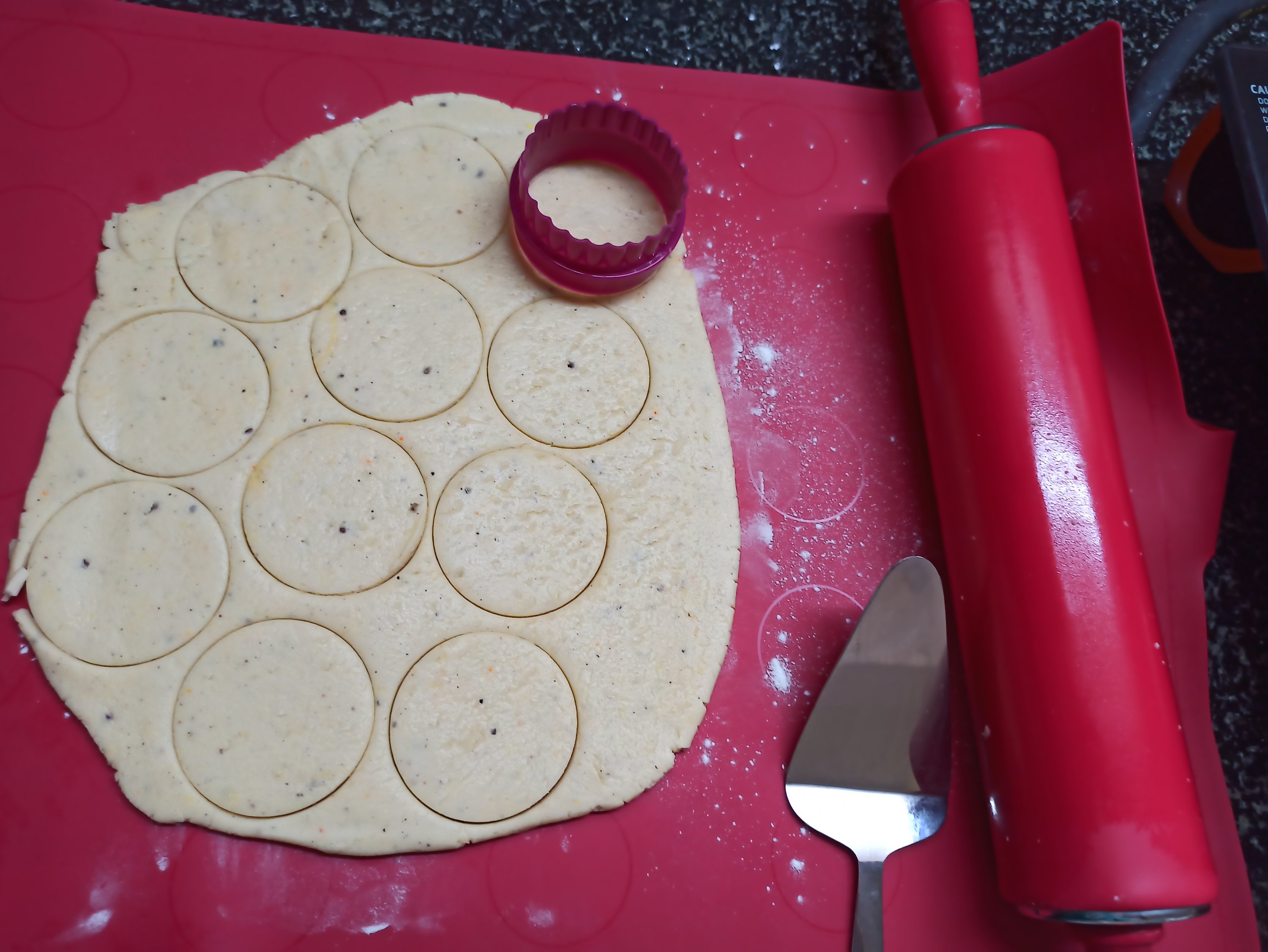 11 . Dust the working surface with little flour and roll out the dough into 1/4 inch thick sheet .