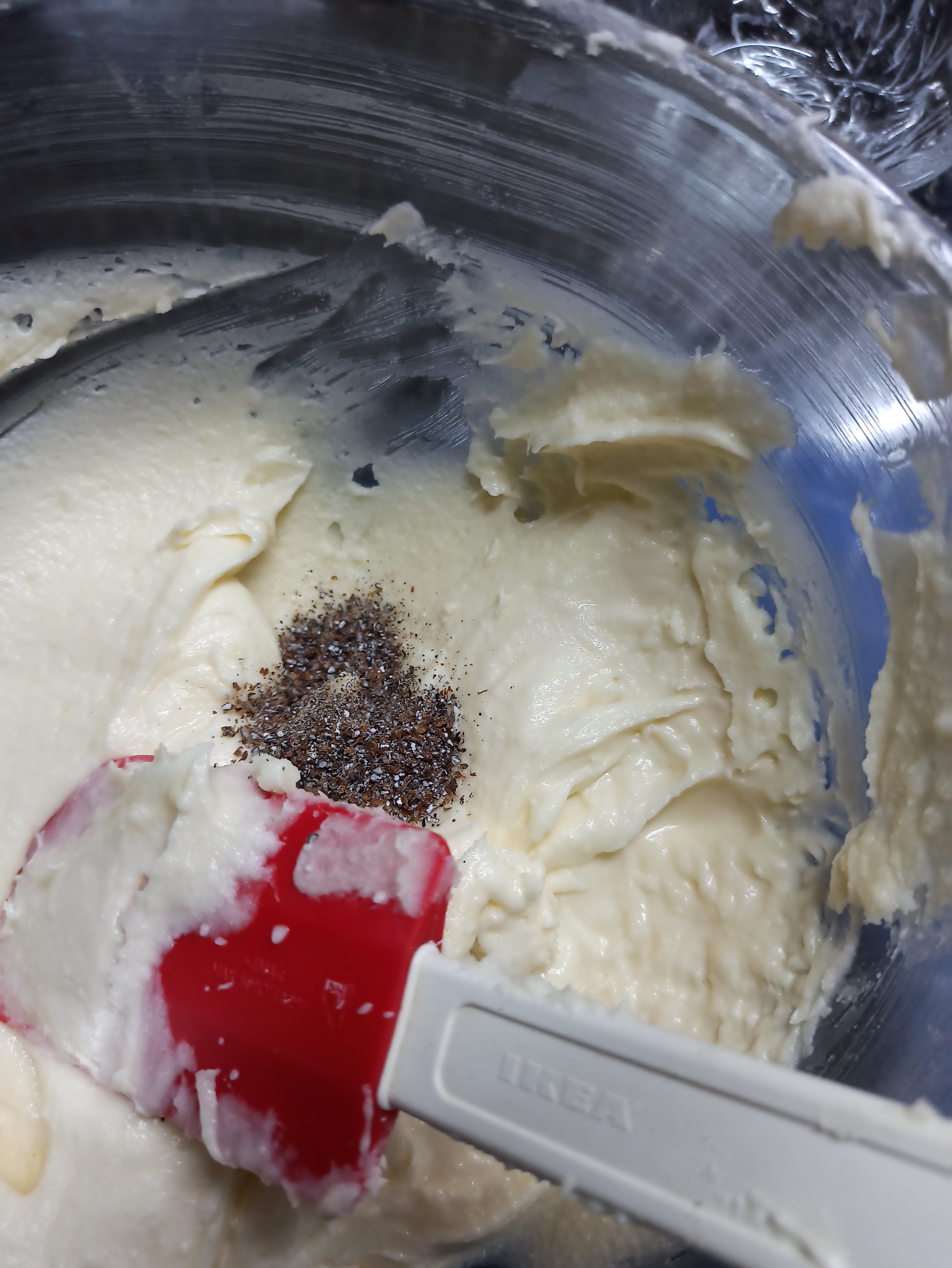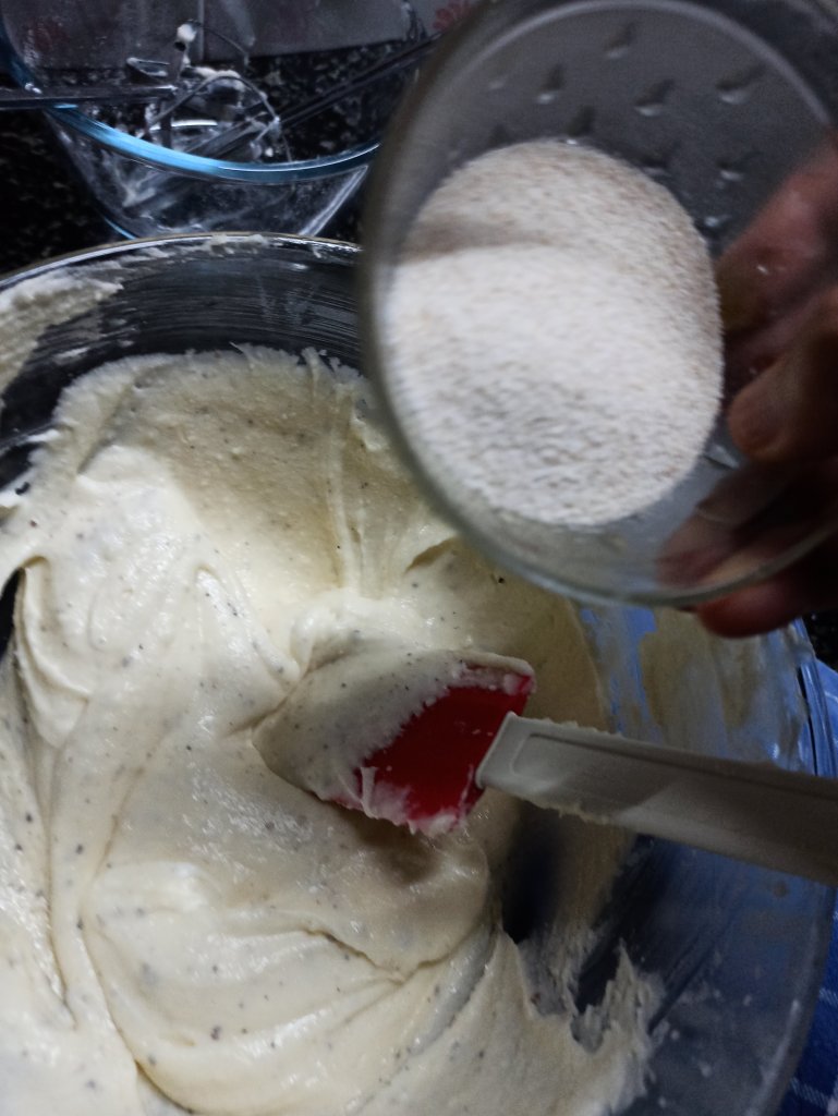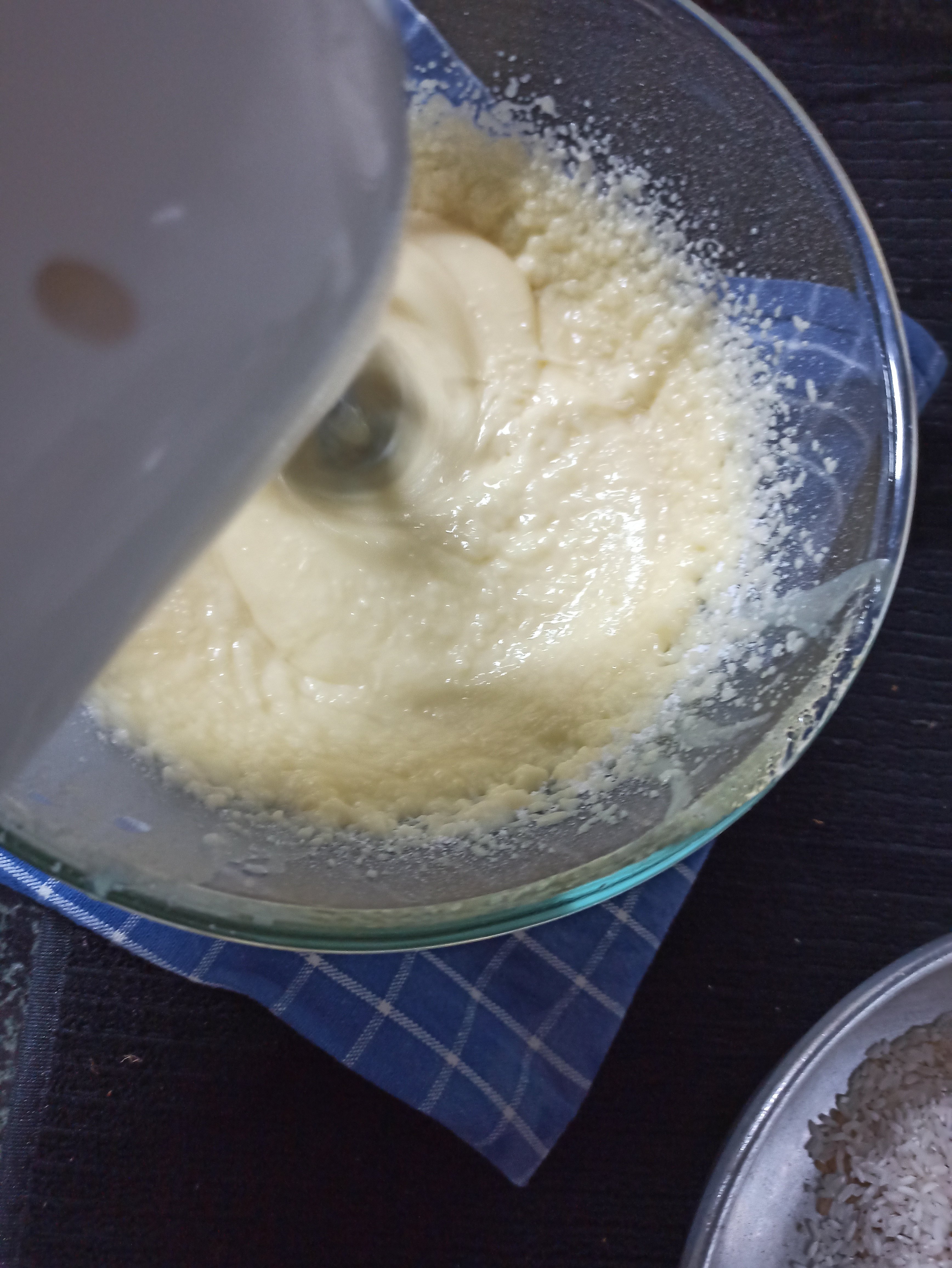 2 . Now add powder sugar and begin to cream the sugar , dalda and ghee mixture using whisker .