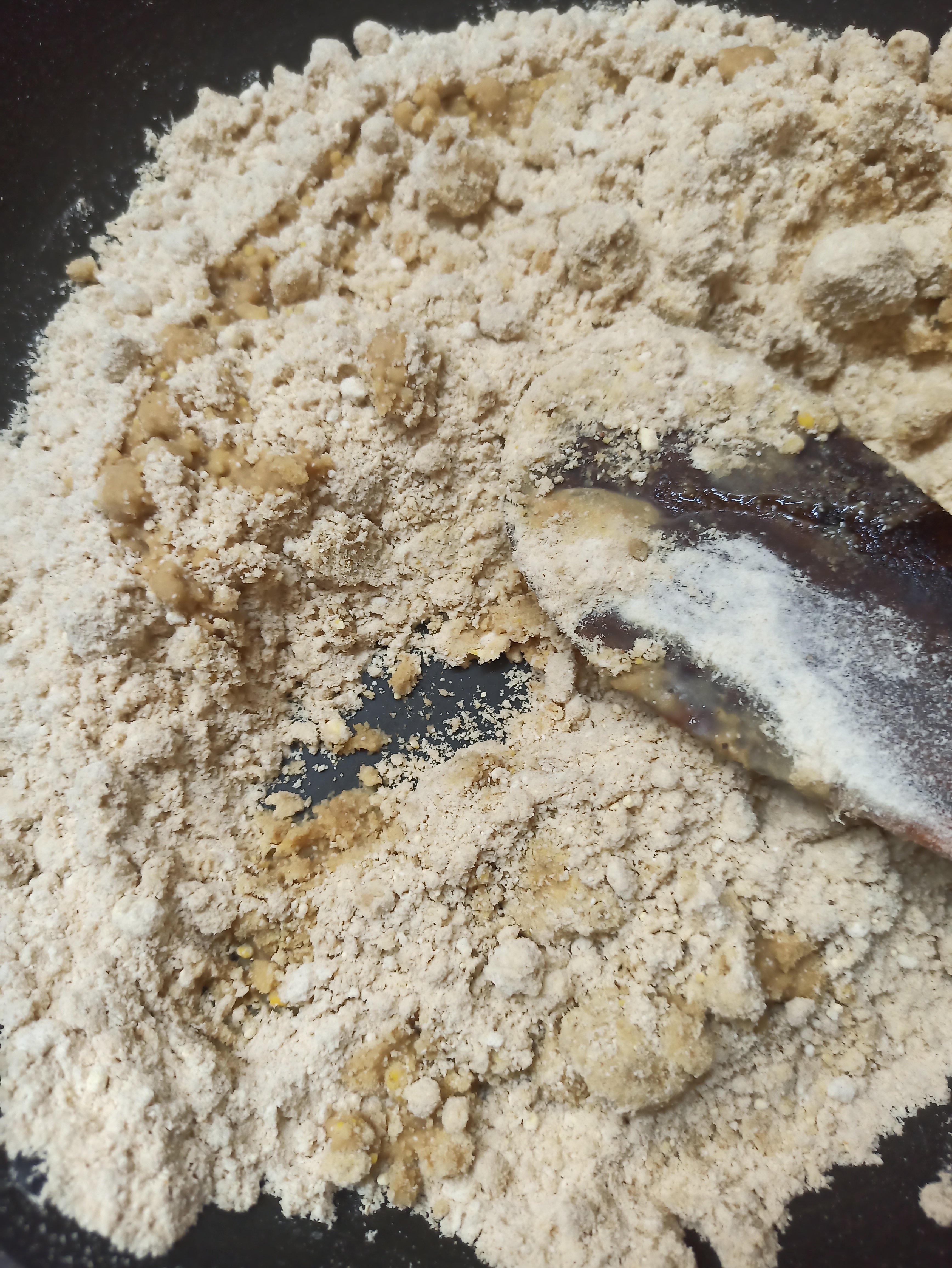 4 . Start to roast it on low flame , do not increase the flame and do not forget to keep stirring the mixture around every few seconds . Like this rost the flour about 30 – 35 minutes .