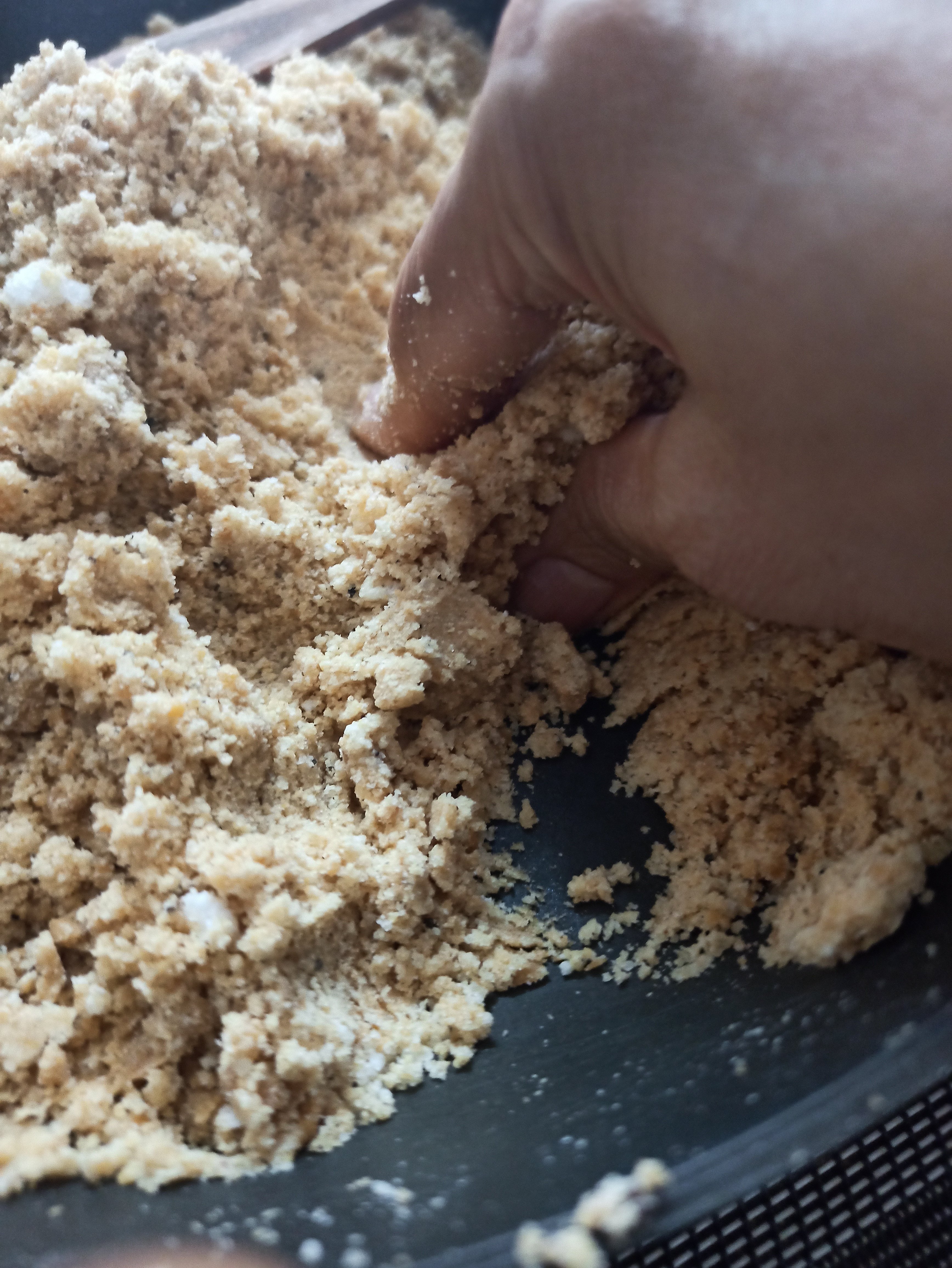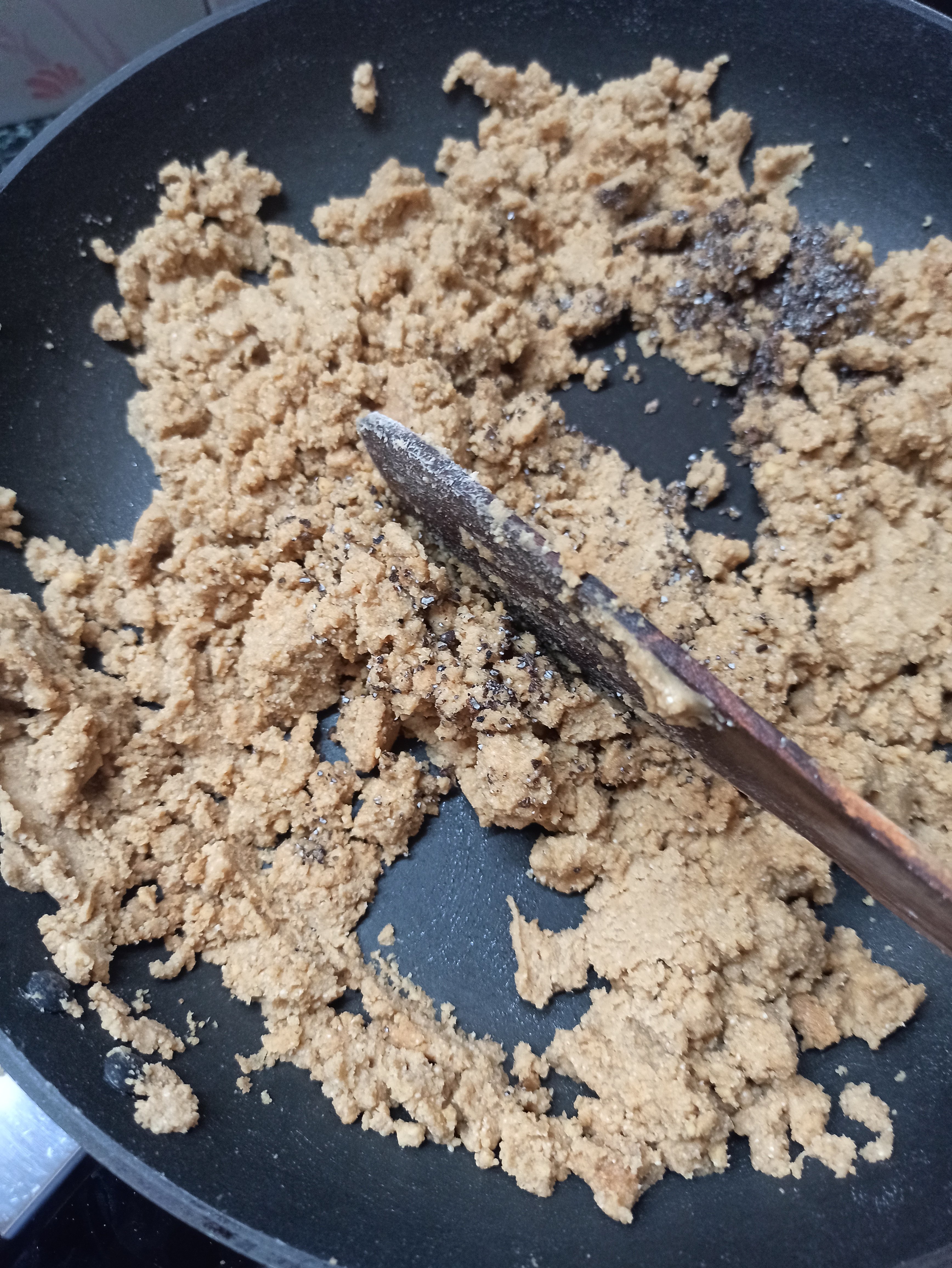 3 . Now add melted ghee little by little . Dont add more ghee . Mix it well .