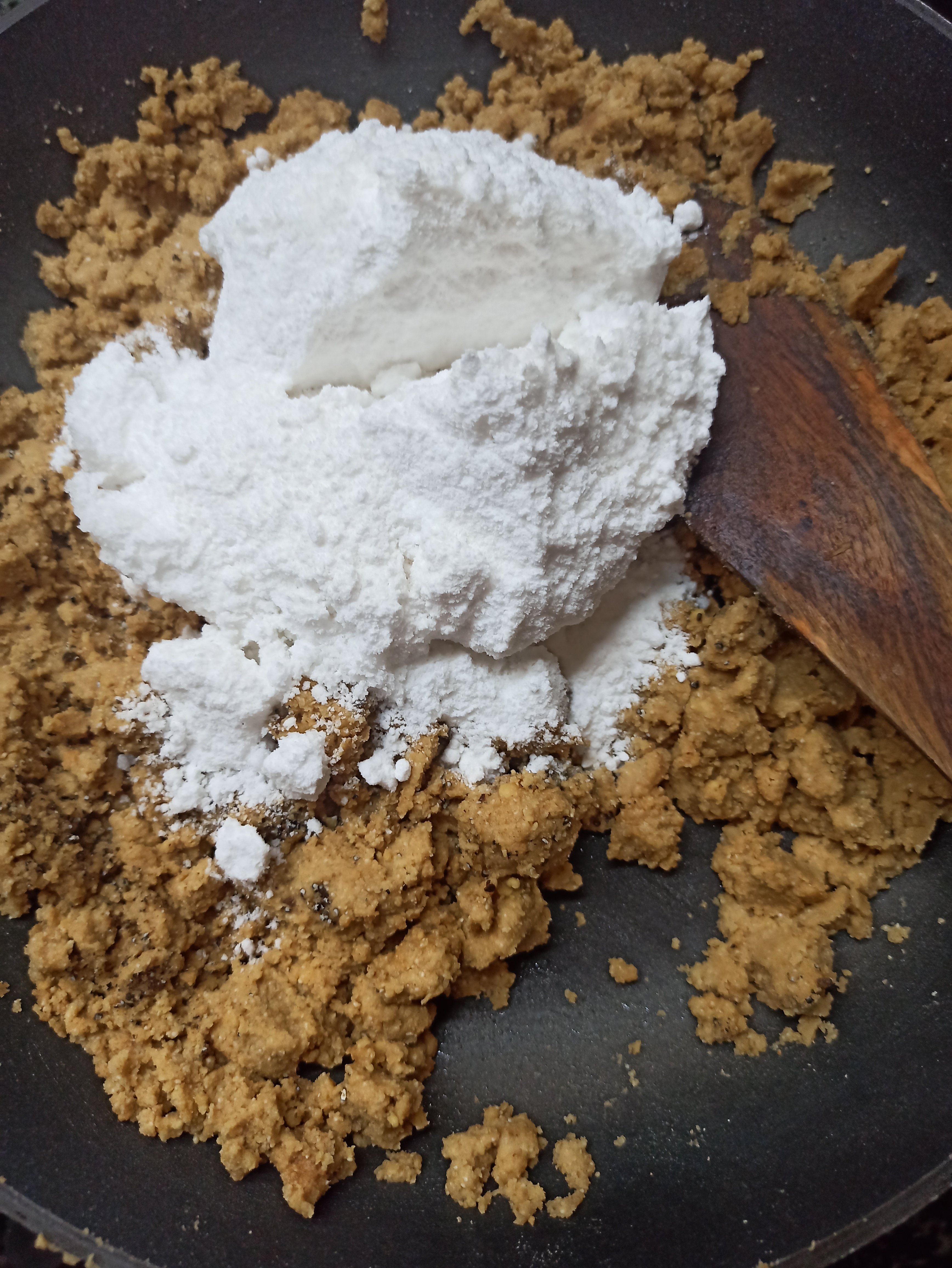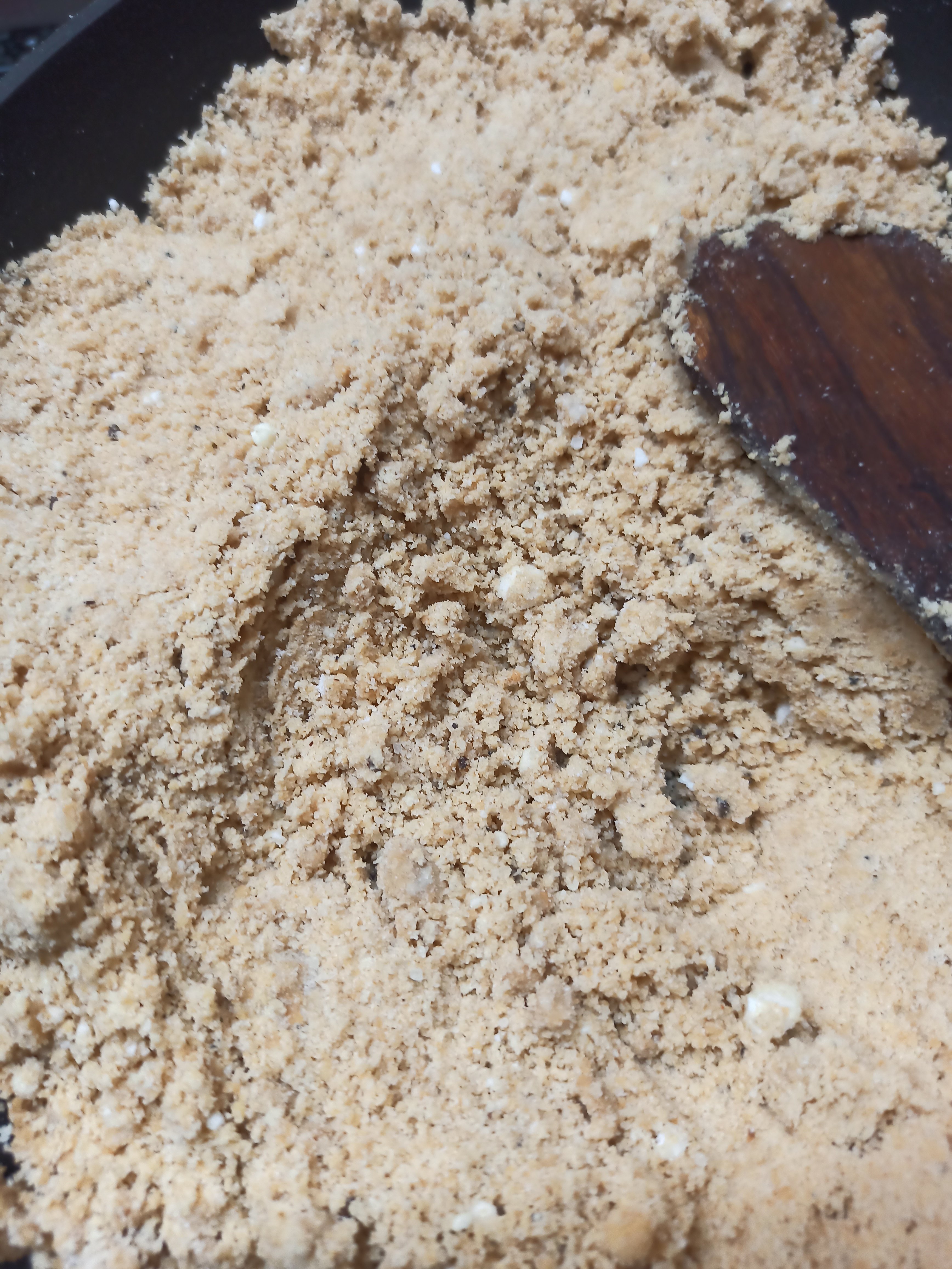 9 . Transfer the roasted flour in to wide bottom dish ( so you can mix it well easily ) . Set the flour mixture aside for 5 – 10 minutes so it cools down a bit . When it still warm you can prepare making laddus because it binds better .