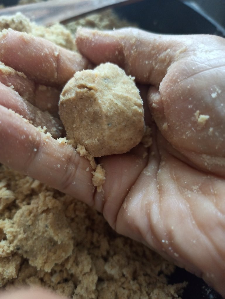 11 . To make a laddu take a small portion of the flour mixture in the palm of your hand and press tightly together .