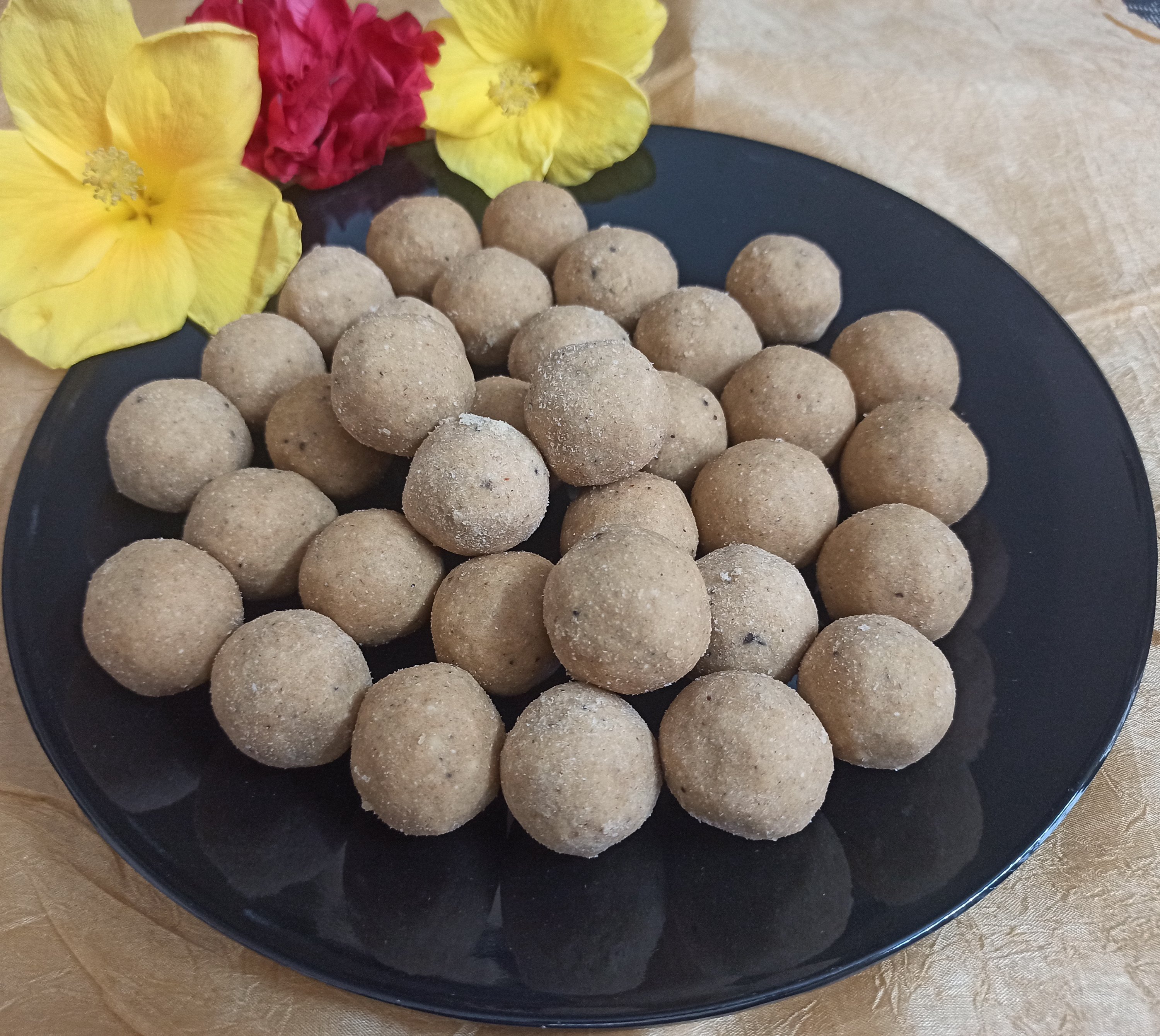 Churmundo is a konkani style laddu made out of wheat flour . Which is staple konkani sweet . Though of course like most recipes there are several ways this laddu can be made . Tellechery , kannur side konkanis prepare this laddu by another method , that I will prepare and post shortly . But this particular churmundo recipe I learnt from my mother . Incorporates with wheat flour , rawa and besan , for that perfect melt in mouth delicious goodness . She used Bura sugar for this laddu , here I am using sugar powder instead of Bura sugar .