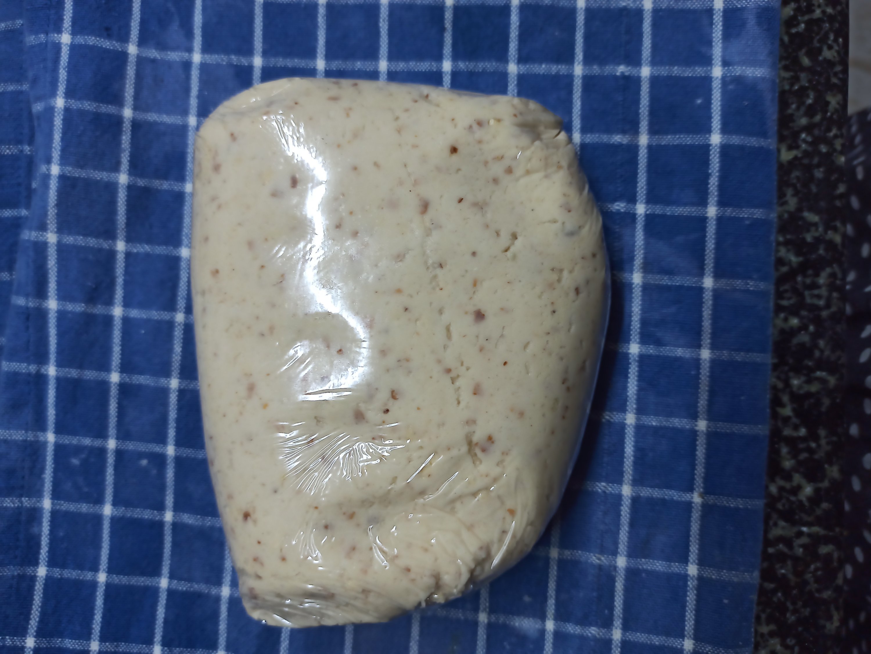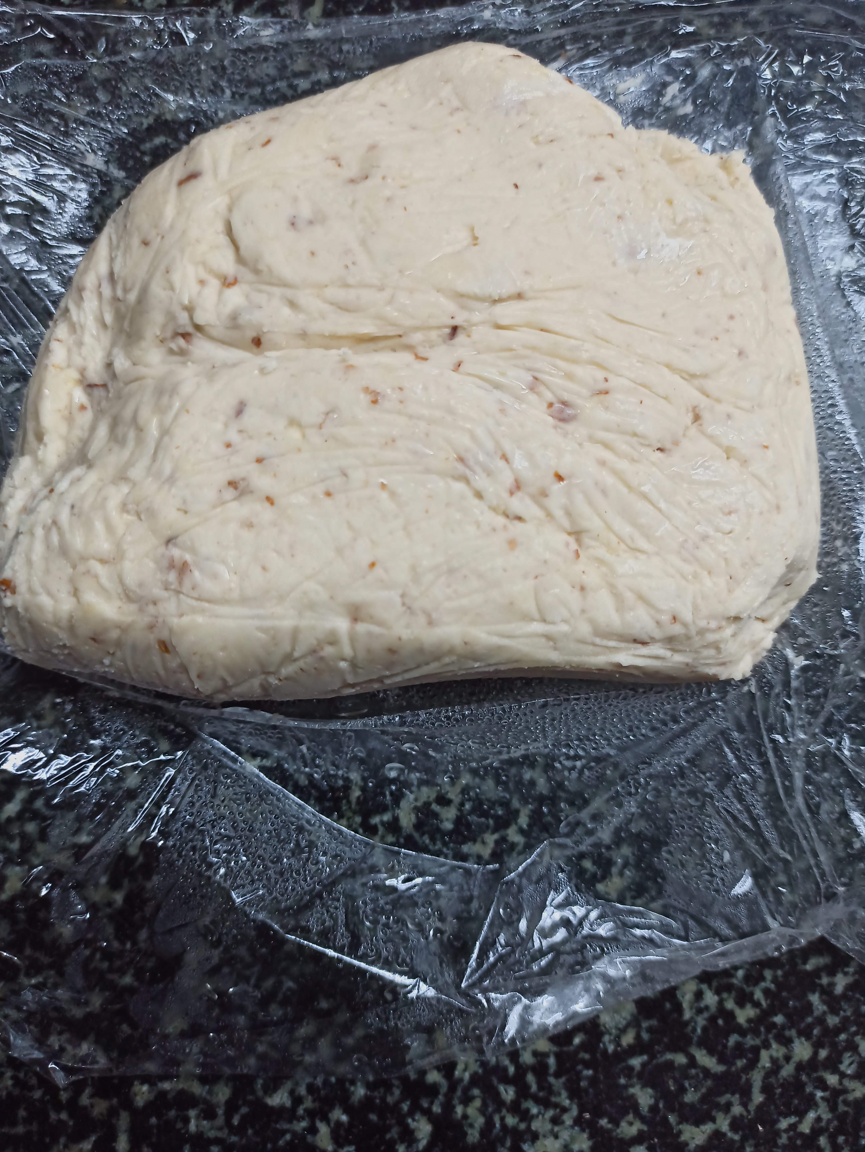 7 . Dough will be sticky at this time so wrap the dough with cling wrap and chill the dough in to the refrigerator for about 20 – 30 minutes and it won’t be sticky any more .