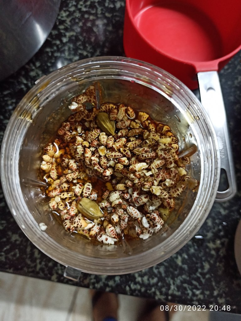 2 . Grind the soaked layi ( puffed rice ) adding enough jaggery syrup to a smooth paste.