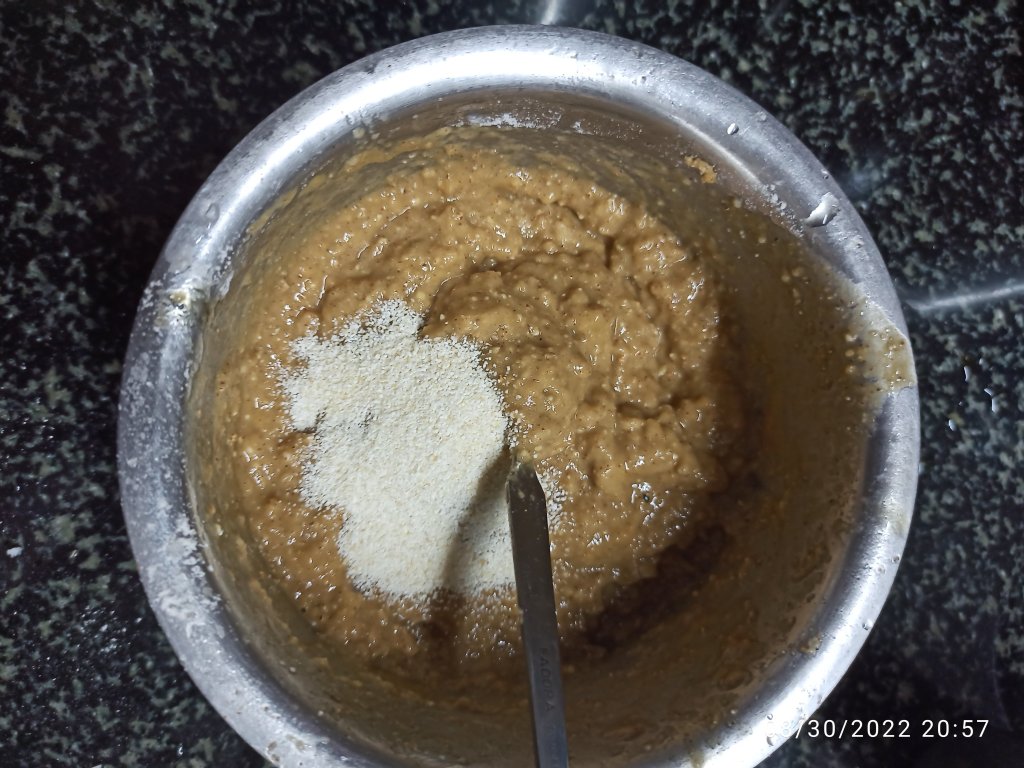 3 . Pour this paste in to a vessel and add wheat flour , rawa , salt and cardamom powder . If needed add little water to make a batter without any lumps and pouring consistency ( if needed use mixer grinder to mix the batter well ) .