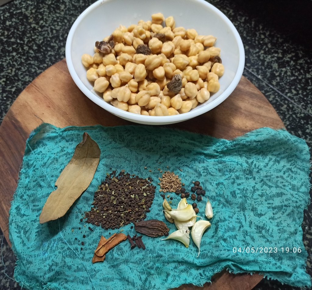 4 . Further in a pressure cooker add the chana along with masala potli and enough water, make sure the level of the water is 2 inches above the chick peas .