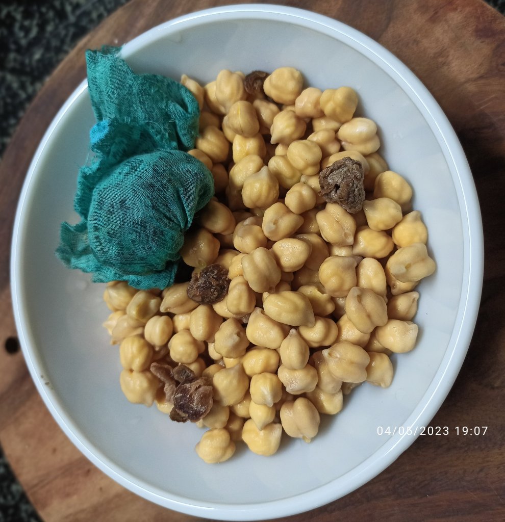 1 . Wash and soak chick peas ( Chana ) in enough water with dry amla for 8 – 10 hours .