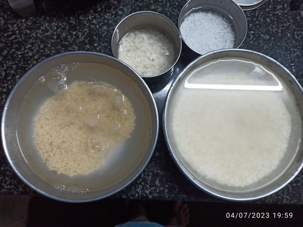 1 . Wash and soak idli rice , rice flakes and sagoo separately for atleast 5 – 6 hours .