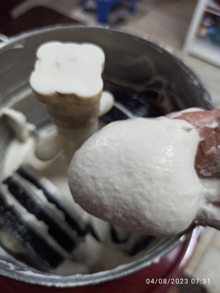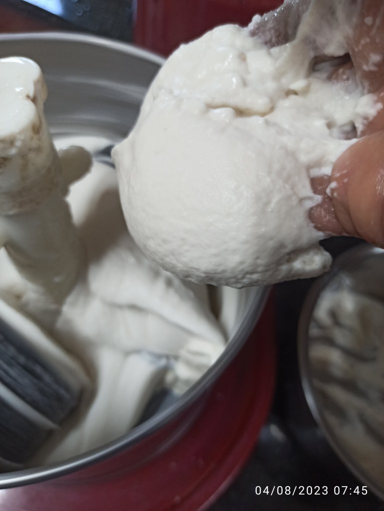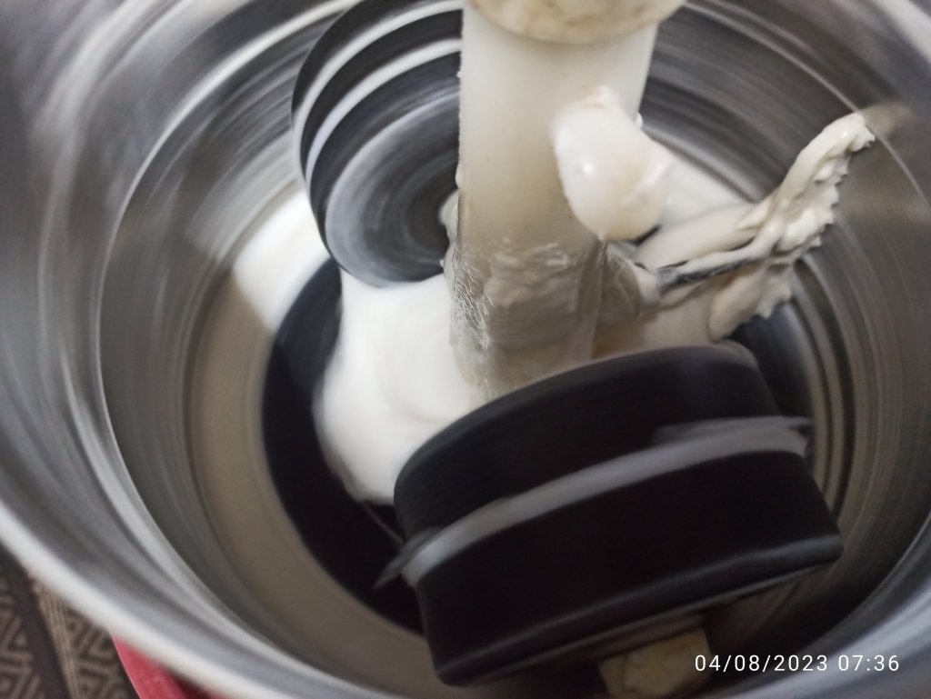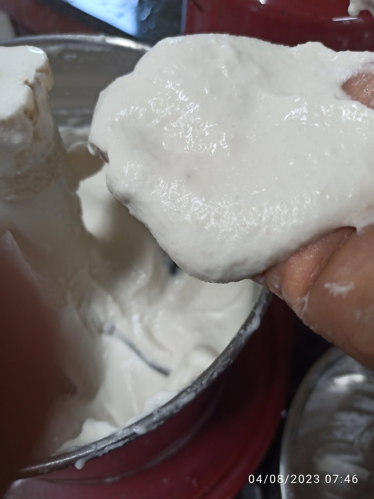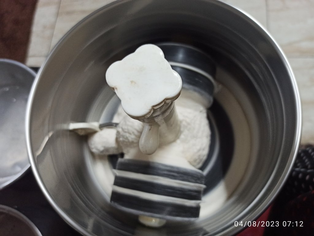 3 . Grind the urad dal mixture in to fluffy, soft and smooth in wet grinder. Do not pour water more but sprinkle some as needed to get the smooth texture . At least grind for 20 – 25 minutes . Remove it in to mixing bowl .