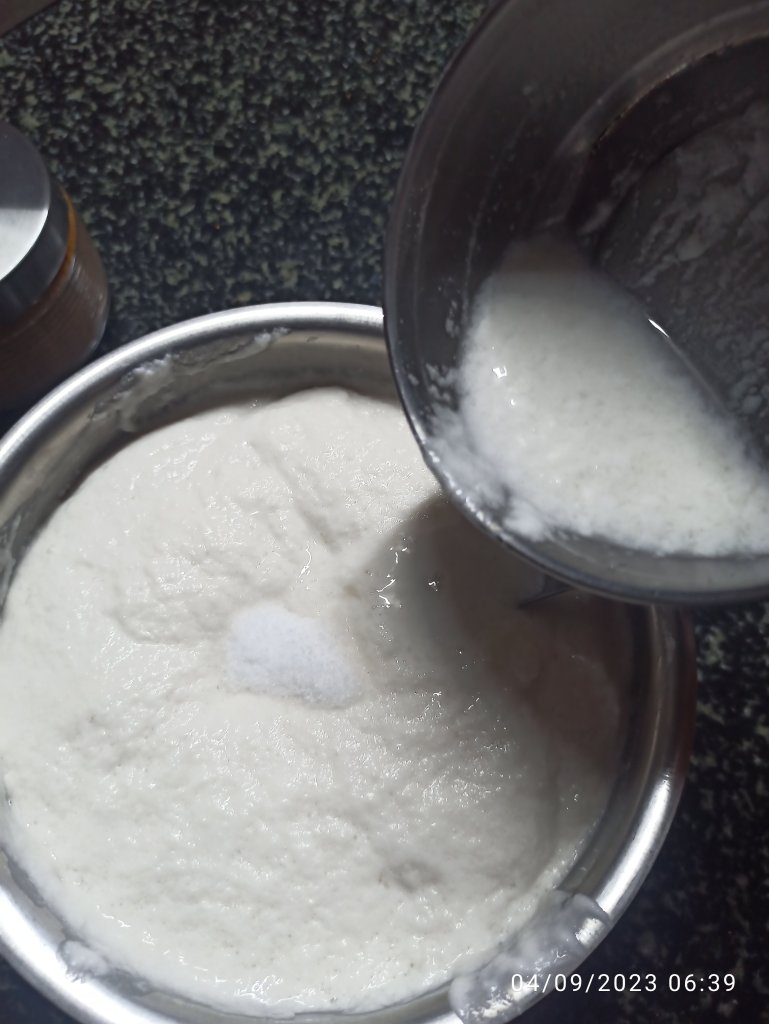 5 . Add soaked and well drained in to grinder adding enough water as needed, grind in to a coarse paste. It should feel grainy to touch . Now add urad batter and grind to few seconds . This is to done for mixing two batter properly .