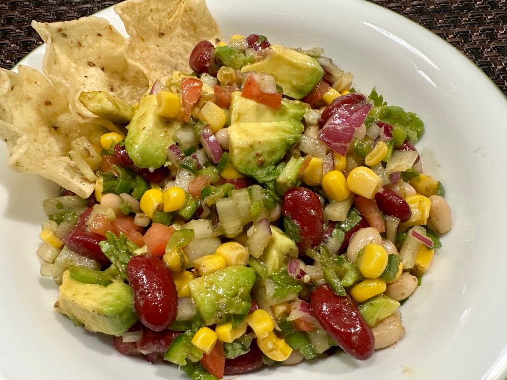 Cowboy Caviar sometimes called Texas Caviar or Mexican Caviar is like a cross between a bean salad and fresh salsa. It combines any two types of Beans like Chana , Rajma , Black Beans , Black eye peas. Use only bigger size beans don’t use small ones like green grams and masoor,with colorful medley of fresh vegetables and tangy balsamic- lime vinaigrette. This super fresh and colorful cowboy caviar combined with beans, delicious summer vegetables and a sweet and tangy lime dressing to make a bold and versatile dish that you will find yourself making over and over, from party dip to a salad topper . This can serve as a side dish with dinner as a chunky dip for chips as a topping for tacos, stuffed in to a burrito or as a burrito bowl and so much more .