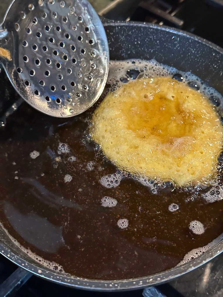 7. Take out the Malpuri from the ghee . Press it slightly with another spatula to remove excess ghee from the Malpuri. Let it drain on paper towel . Consume with in 2 – 3 days .
