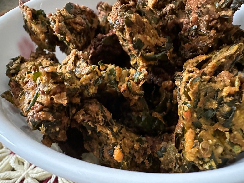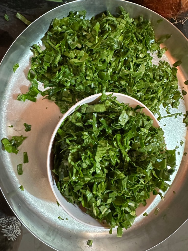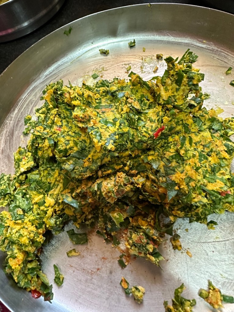 This is one of the dish that you don’t see in restaurants . It’s uses the leaves of the cauliflower that are normally discarded. It’s is considered quite a delicacy. The cauliflower leaves are not only edible they are delicious also, leaves and stems are healthy and nutritious chocked full of fiber,calcium and vitamin C . I learned this recipe from my younger sister Ranjitha . This is her mother-in- law’s recipe .