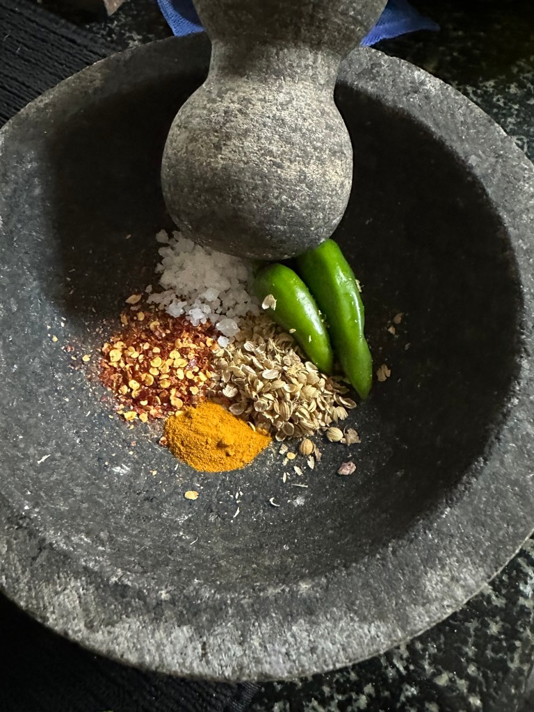 3. In a mortar add coriander seeds,ginger,green chilies,chili flakes and salt. Crush it into coarslely.